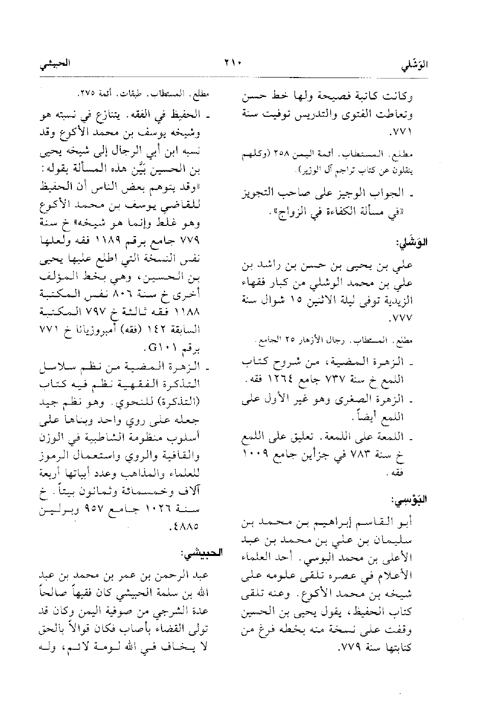 - علي بن يحيى بن حسن بن راشد بن علي بن محمد الوشلي من كبار فقهاء الزيدية توفى ليلة الاثنين 15 شوال سنة 777.