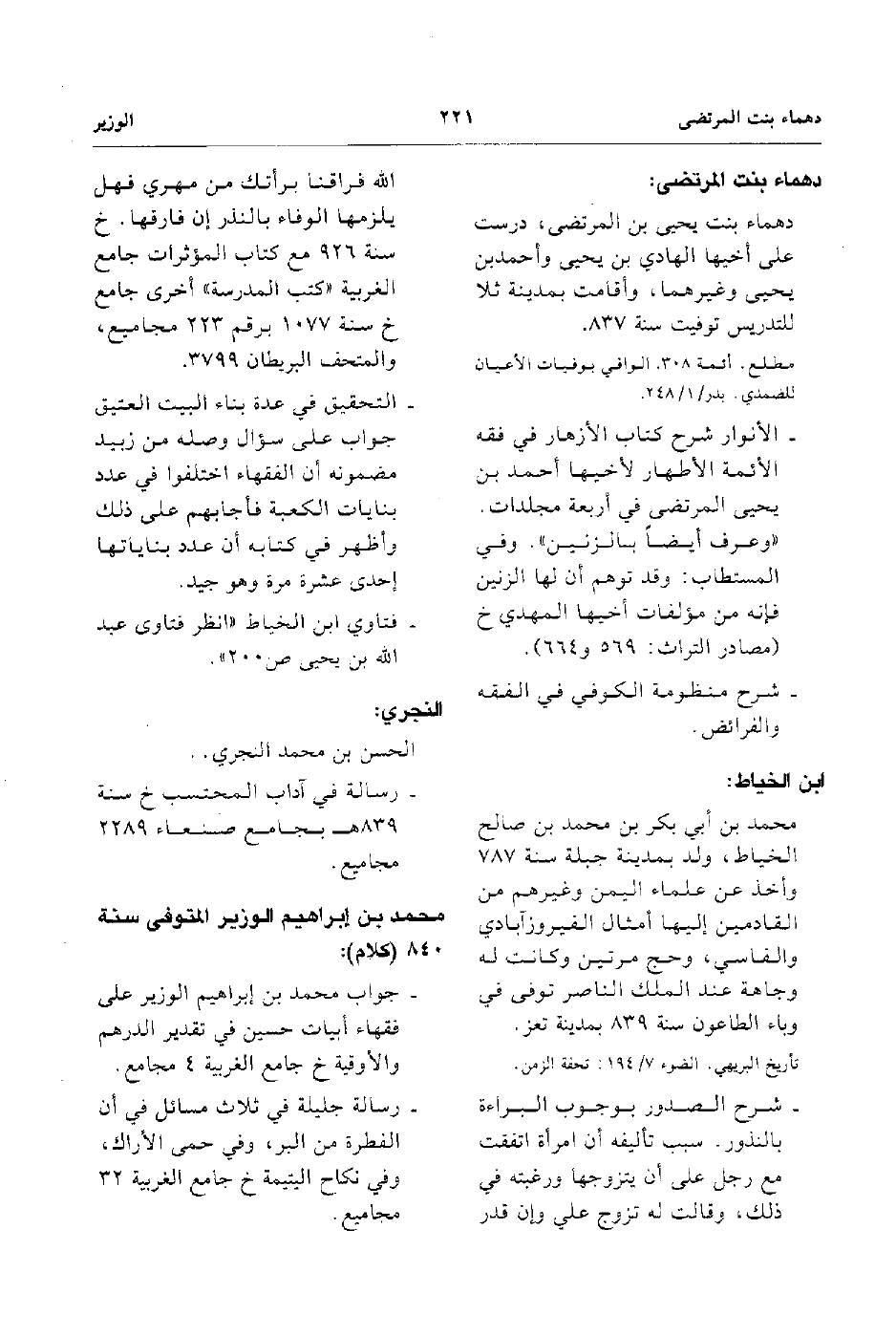 - دهماء بنت يحيى بن المرتضى درست على أخيها الهادي بن يحيى وأحمد بن يحيى وغيرهما وأقامت بمدينة ثلا للتدريس توفيت سنة 837.