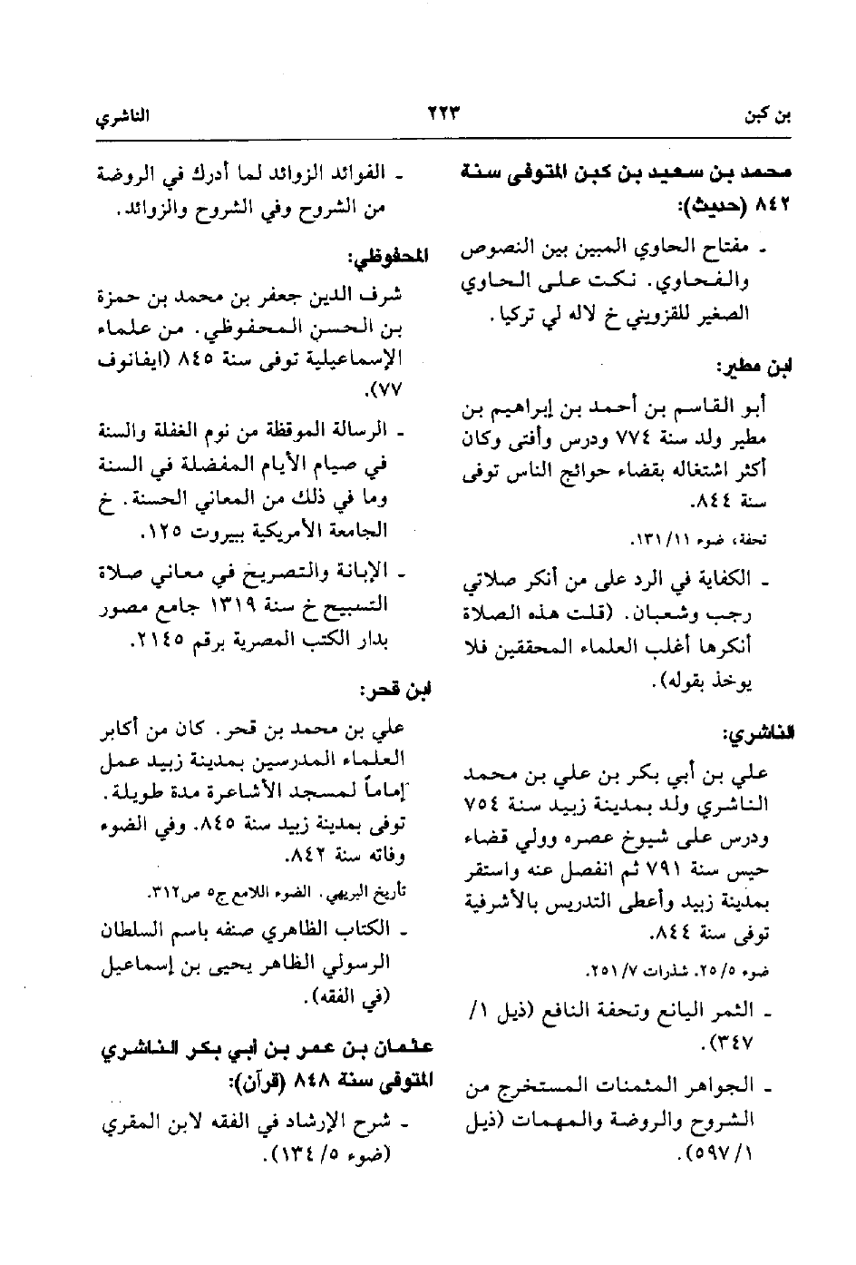 - علي بن أبي بكر بن علي بن محمد الناشري ولد بمدينة زبيد سنة 754 ودرس على شيوخ عصره وولي قضاء حيس سنة 791 ثم انفصل عنه واستقر بمدينة زبيد وأعطي التدريس بالأشر فيه توفى سنة 844.