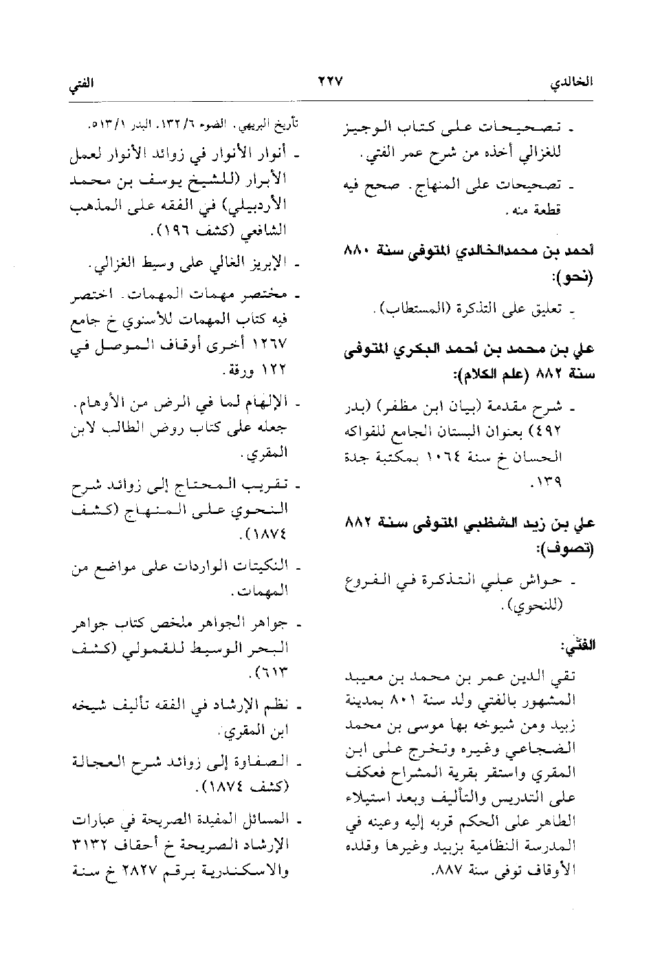 - الإبريز الغالي على وسيط الغزالي. مختصر مهمات المهمات اختصر فيه كتاب المهمات للأسنوي خ جامع 1267 أخري أوقاف الموصل في 122 ورقة.