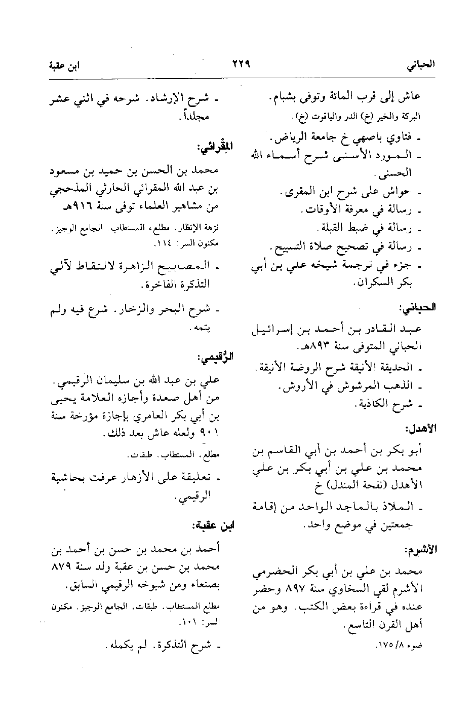 - محمد بن الحسن بن حميد بن مسعود بن عبد الله المقرائي الحارثي المذحجي من مشاهير العلماء توفى سنة 916هـ. المصابيح الزاهرة لالتقاط لآلي التذكرة الفاخرة. شرح البحر والزخار شرع فيه ولم يتمه.