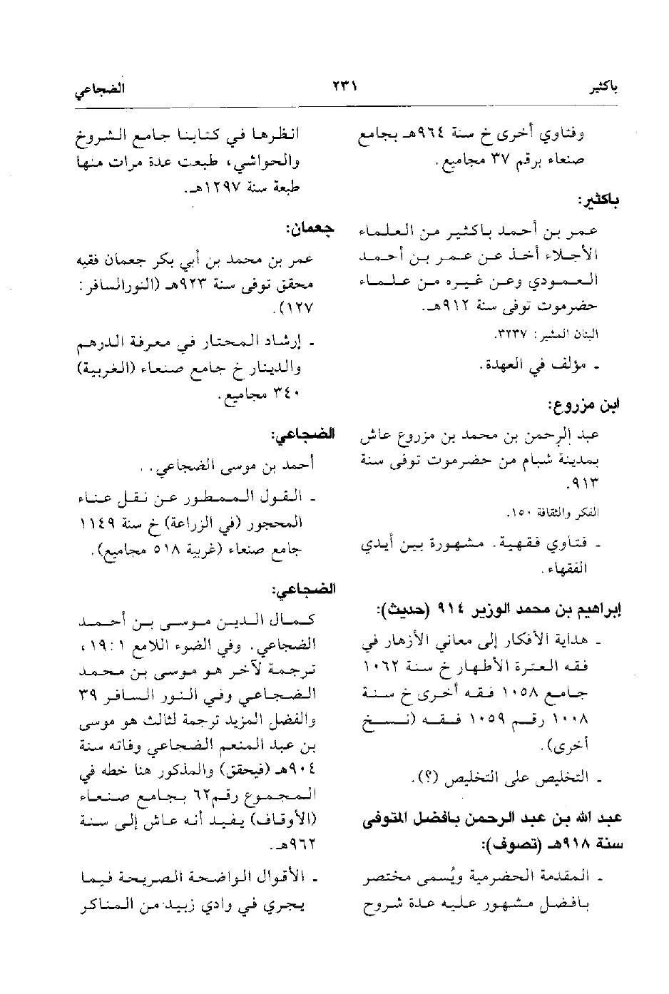 - كمال الدين موسي بن أحمد الضجاعي وفي الضوء اللامع 1: 19 ترجمة لآخر هو موسي بن محمد الضجاعي وفي النور السافر 39 والفضل المزيد ترجمة لثالث هو موسى بم عبد المنعم الضجاعي وفاته سنة 904هـ فيحقق والمذكور هنا خطة في المجموع رقم 62 بجامع صنعاء الأوقاف يفيد أنه عاش إلى سنة 962هـ.