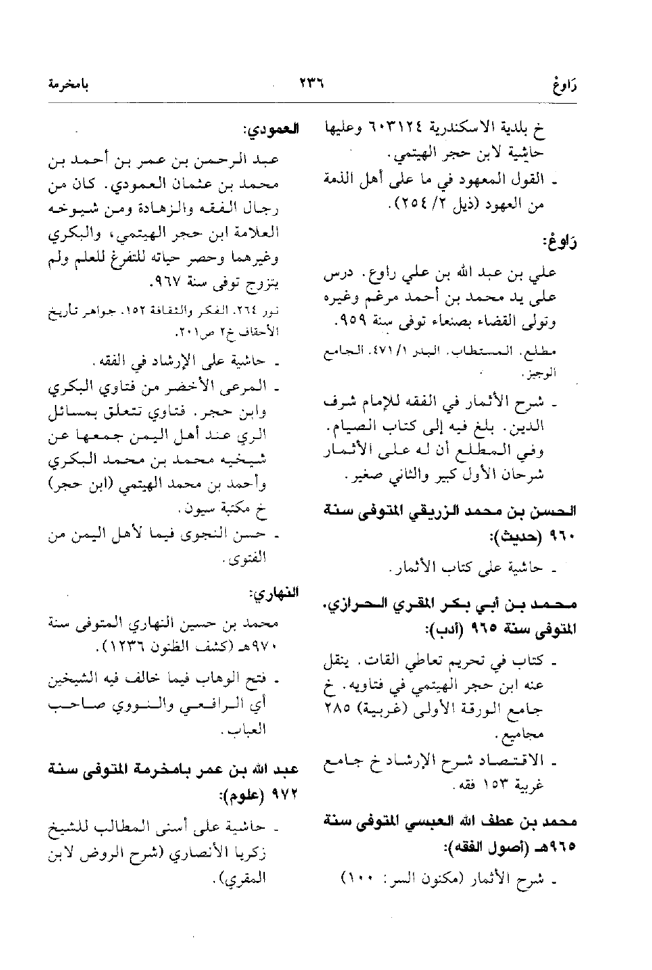 - عبد الرحمن بن عمربن أحمد بن محمد بن عثمان العمودي كان من رجال الفقه والزهادة ومن شيوخه العلامة ابن حجر الهيتمي والبكري وغيرهما وحصر حياته للتفرغ للعلم ولم يتزوج توفى سنة 967.