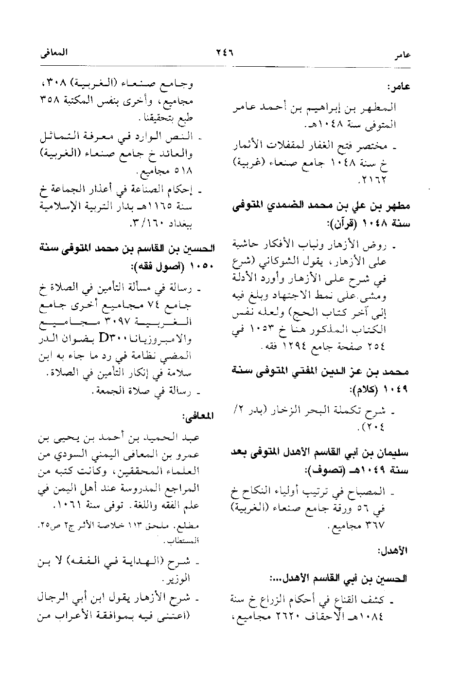 - المطهر بن إبراهيم بن أحمد عامر المتوفى سنة 1048هـ. مختصر فتح الغفار لمقفلات الأثمار خ سنة 1048 جامع صنعاء غربية 2162.