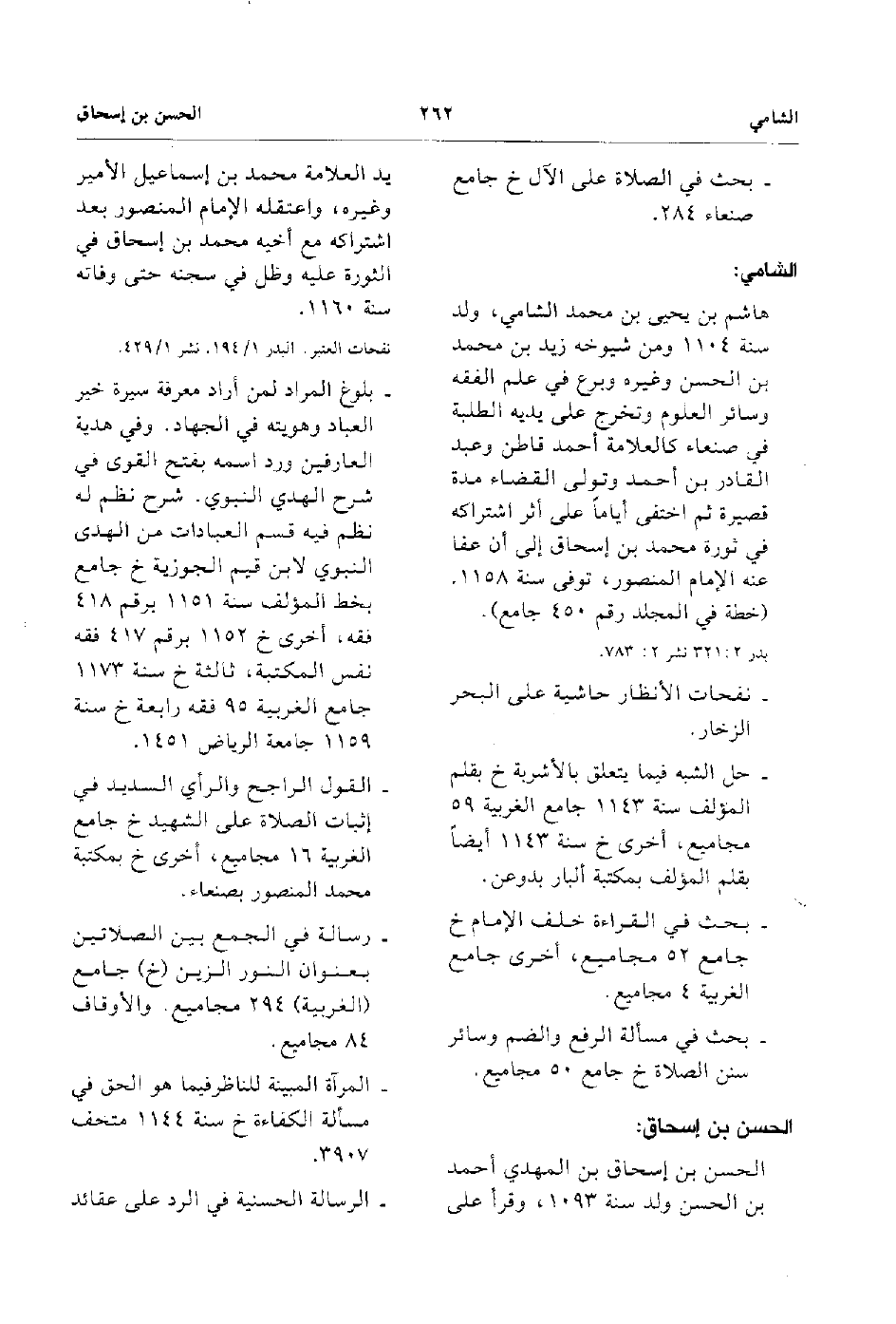 - هاشم بن يحيى بن محمدالشامي ولد سنة 1104 ومن شيوخه زيد بن محمد بن الحسن وغيره وبرع في علم الفقه وسائر العلوم وتخرج على يديه الطلبة في صنعاء كالعلامة أحمد قاطن وعبد القادر بن أحمد وتولي القضاء مدة قصيرة ثم اختفي أياماًعلي أثر اشتراكه في ثورة محمد بن إسحاق إلى أن عفا عنه الإمام المنصور تفوى سنة 1158 ( خطة في المجلد رقم 450 جامع).