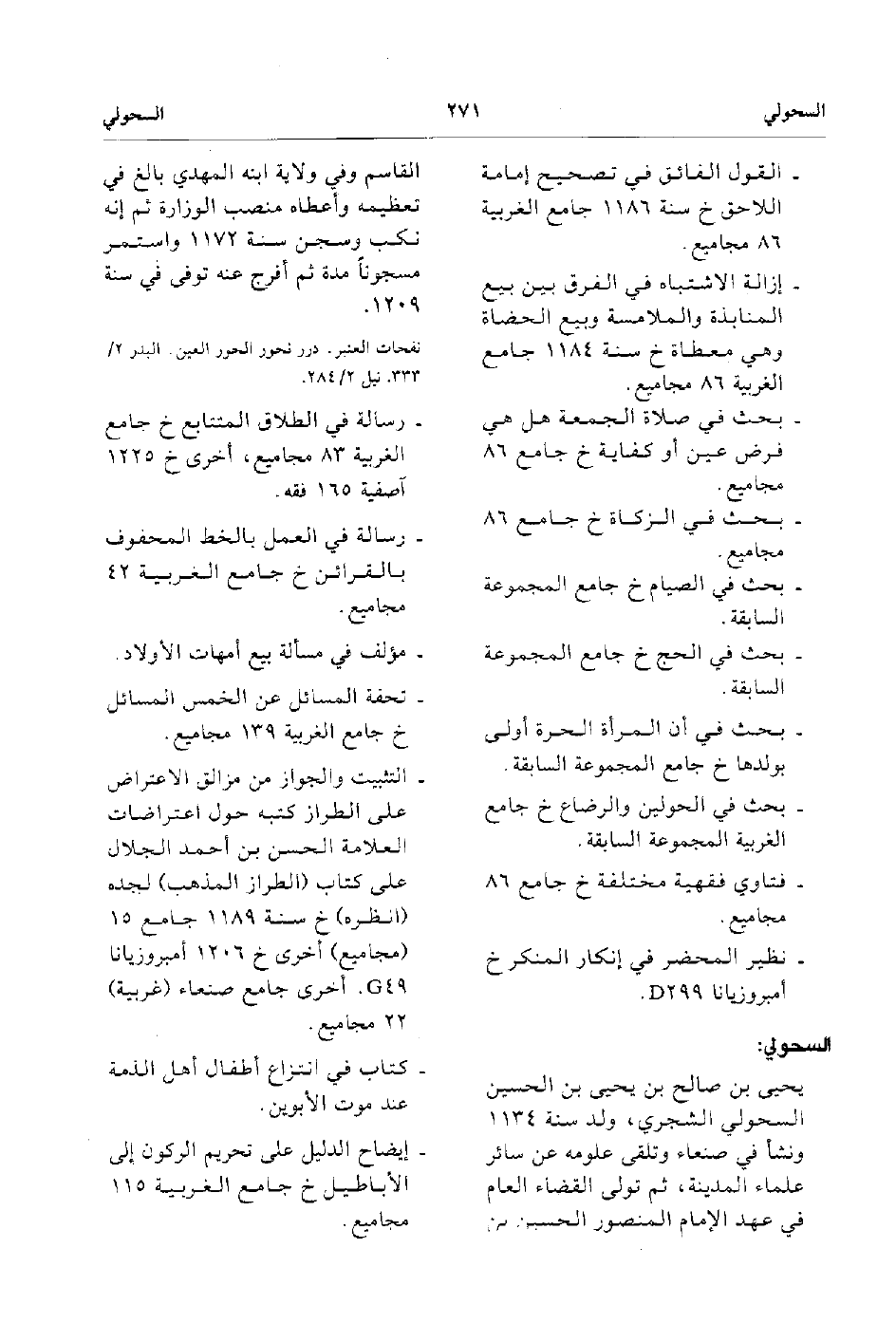 - يحيى بن صالح بن يحيى بن الحسن السحولي الشجري ولد سنة 1134 ونشأ في صنعاء وتلقى علومه عن سائر علماء المدينة ثم تولى القضاء العام في عهد الإمام المنصور الحسين بن القاسم وفي ولاية ابنه المهدي بالغ في تعظيمه وأعطاه منصب الوزارة ثم إنه نكب وسجن سنة 1172 واستمر مسجوناً مدة ثم افرج عنه توفى في سنة 1209.