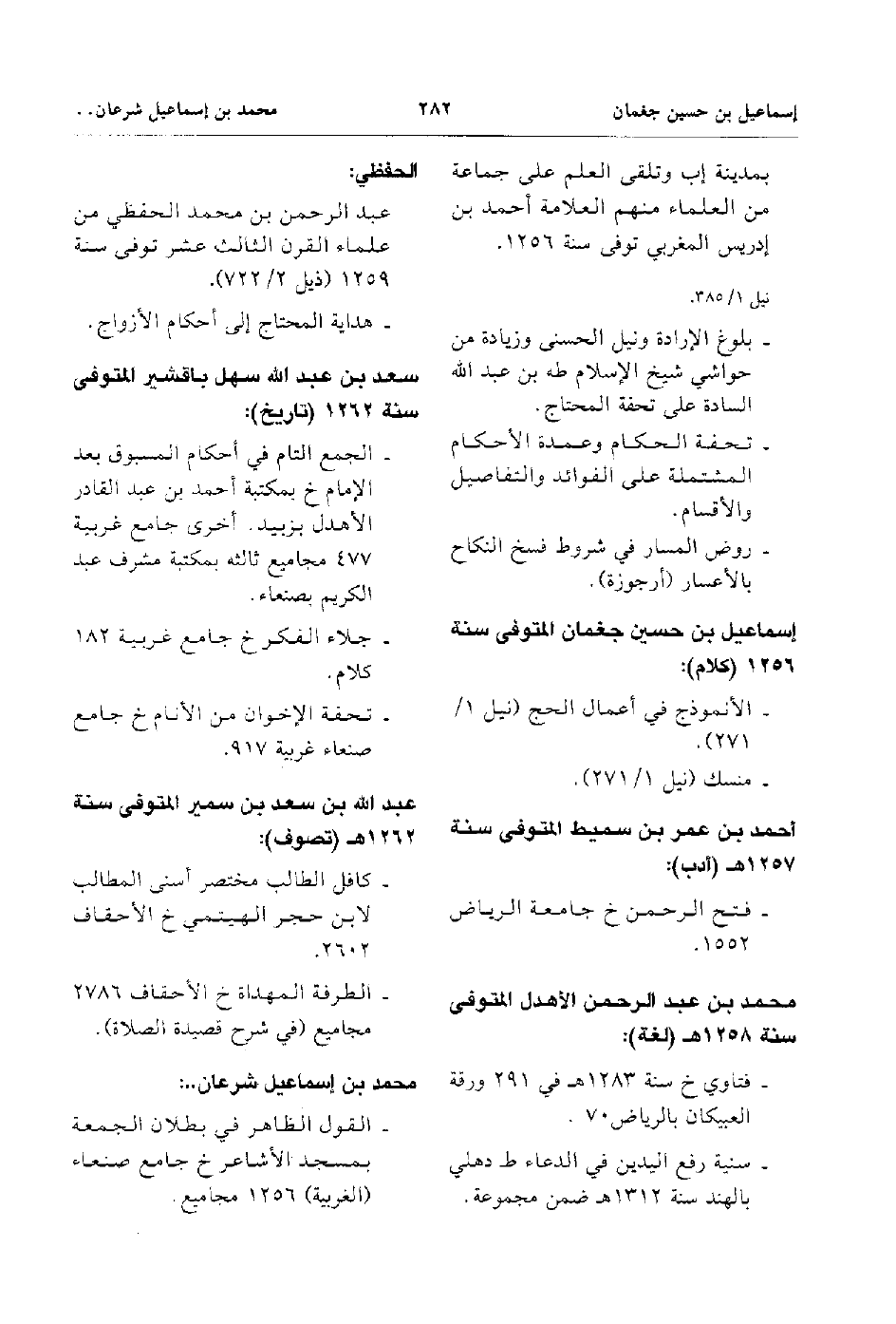 - عبد الرحمن بن محمد الحفظي من علماء القرن الثالث عشر توفى سنة 1259 ذيل 2/722.