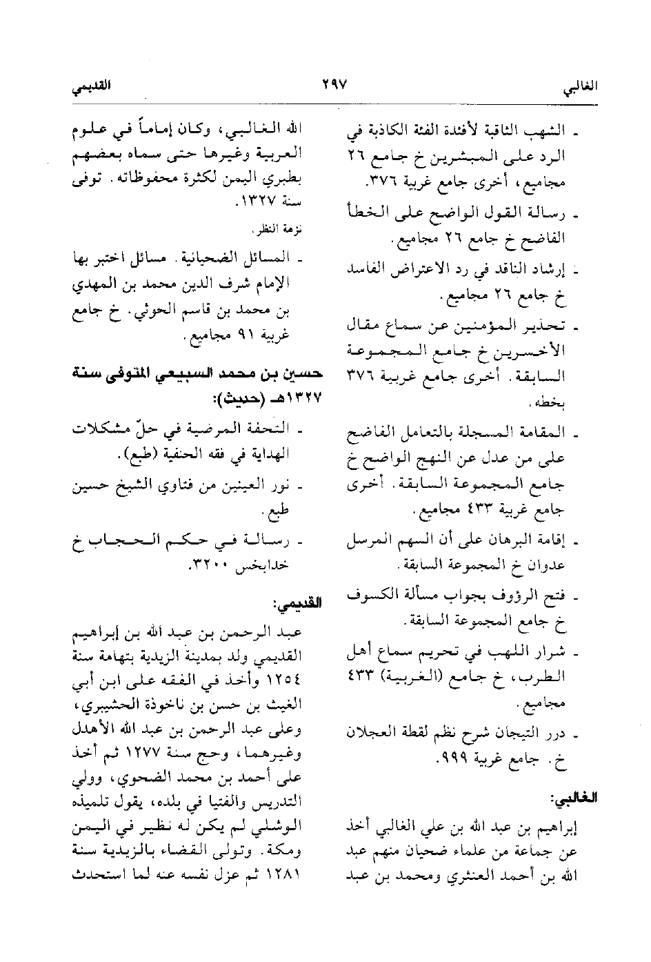 - عبد الرحمن بن عبد الله بن إبراهيم القديمي ولد بمدينة الزيدية بتهامة سنة 1254 وأخذ في الفقه على ابن أبي الغيث بن حسن بن ناخوذة الحشيبري وعلى عبد الرحمن بن عبد الله الأهدل وغيرهما وحج سنة 127 ثم أخذ على أحمد بن محمد الضحوي وولي التدريس والفتيا في بلده يقول تلميذه الوشلي لم يكن له نظير في اليمن ومكة وتولي القضاء بالزيدية سنة 1281 قم عزل عنه لما استحدث