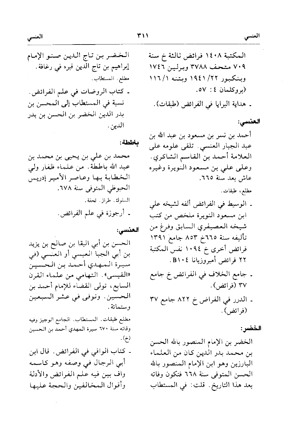 المكتبة 1408 فرائض ثالثة خ سنة 709 متحف 3788 وبرلين 1746 وبنكبور 22/ 1941 وبتنه 1/116 بروكلمان 4: 57. هداية البرايا في الفرائض طبقات.