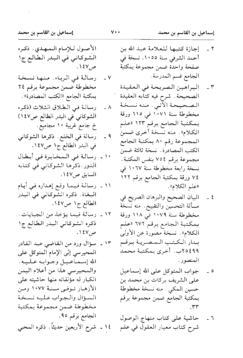 13. سؤال ورد من القاضي عبد القادر المحيرسي الى الإمام المتوكل على الله اسماعيل وجوابه عليه والمحيرسي هذا من اعلام اليمن الكبار له مؤلفاته منها حاشية على الأزهار توفى سنة 1077 ومن السؤال والجواب عليه نسخة مخطوطة ضمن مجموعة بمكتبة الجامع برقم 95.