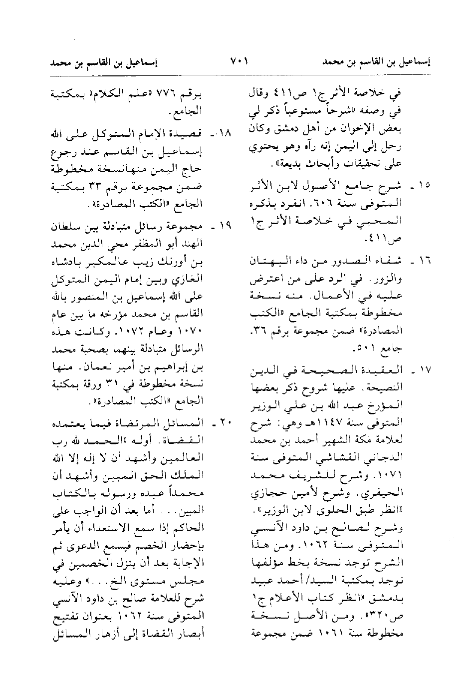 18. قصيدة الإمام المتوكل على الله اسماعيل بن القاسم عند رجوع حاج اليمن منها نسخة مخطوطة ضمن مجموعة برقم 33 بمكتبة الجامع الكتب المصادرة.