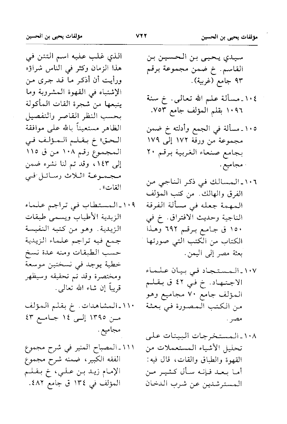 107. المستخرجات البينات على تحليل الأشياء المستعملات من القهوة والطباق والقات قال فيه: أمابعد فإنه سألأ كثي رمن المسترشدين عن شر الدخان الذي غلب عليه اسم التتن في هذا الزمان وكثر في الناس شراؤه ورأيت ان اذكر ما قد جري من الإشتباه في القهوة المشروبة وما يتبعها من شجرة القات المأكولة بحسب النظر القاصر والتفصيل الظاهر مستعينا بالله على موافقة الحق خ بقلم المؤلف في المجموع رقم 108 من ق 115 إلى 143 وقد تم لنا نشره ضمن مجموعة ثلاث رسائل في القات.