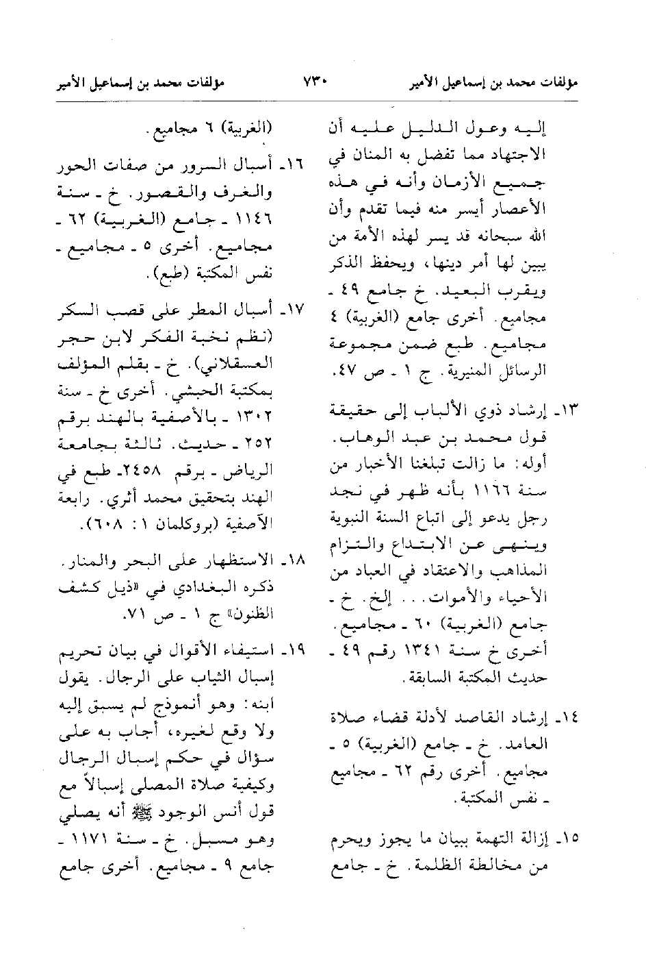 13. إشاد ذوي الألباب إلى حقيقة قول محمد بن عبد الوهاب اوله مازالت تبلغنا الأخار من سنة 1166 بأنه ظه في نجد رجل يدعو إلى اتباع السنة النبوية وينهي عن الابتداع والتزام المذاه والاعتقاد في العباد من الأحياء والأموات إلخ خ جامع الغربية 60 مجاميع اخري خ سنة 1341 رقم 49 حديث المكتبة السابقة.