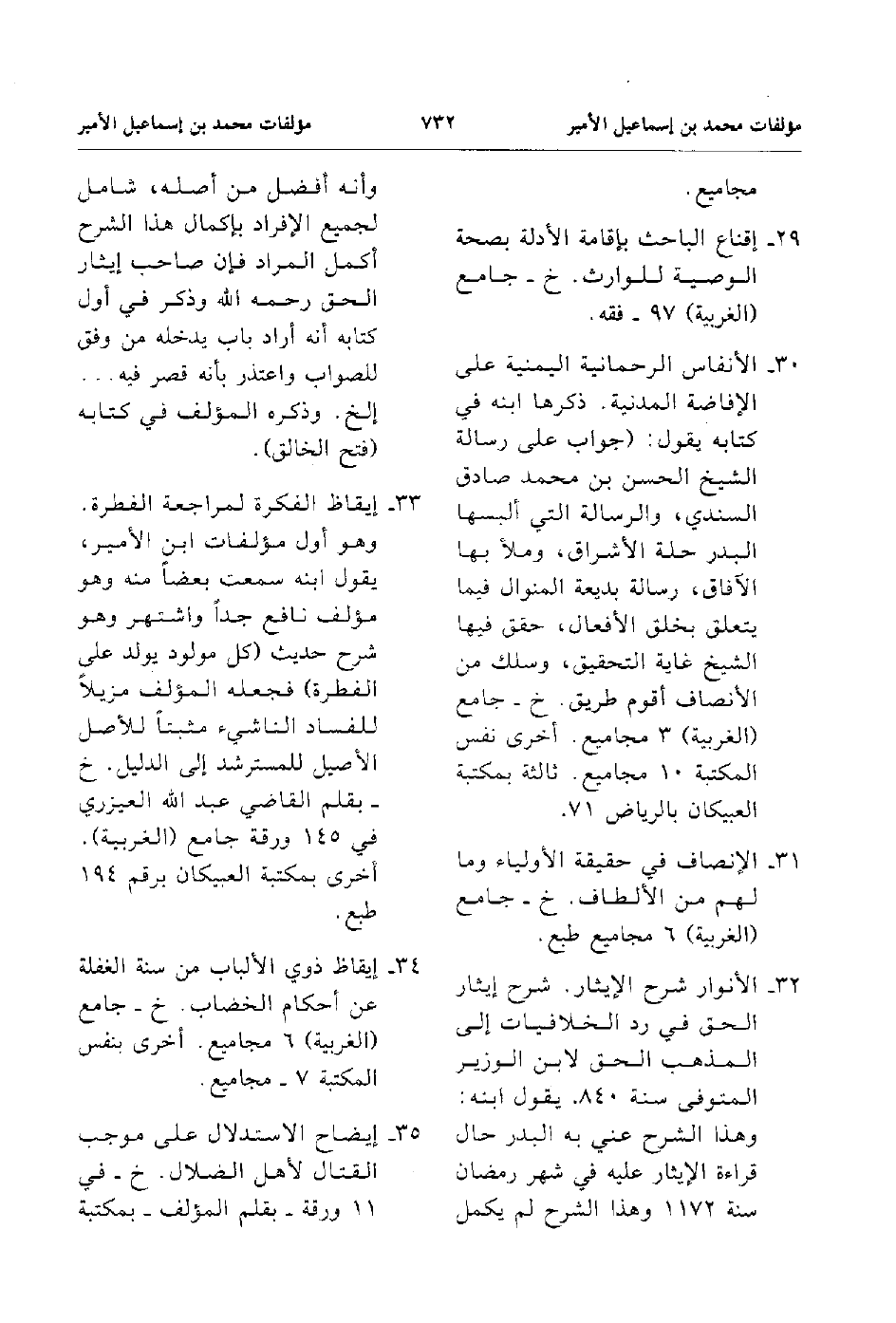 30. الأنفاس الرحمانية اليمنية على الإفاضة المدينة ذكرها ابنه في كتاه يقول جواب على رسالة الشيخ الحسن ن محمد صادق السندي والرسالة التي ألبسها البدر حلة الأشراق وملآ بها الآفاق رسالة بديعة المنوال فيما يتعلق خلق الأفعال حقق فيها الشيخ غاية التحقيق وسلك من الأنصاف أقوم طريق خ جامع الغربية 3 مجاميع أخري نفس المكتبة 10 مجاميع ثالثة بمكتبة العبيكان بالرياض 71.