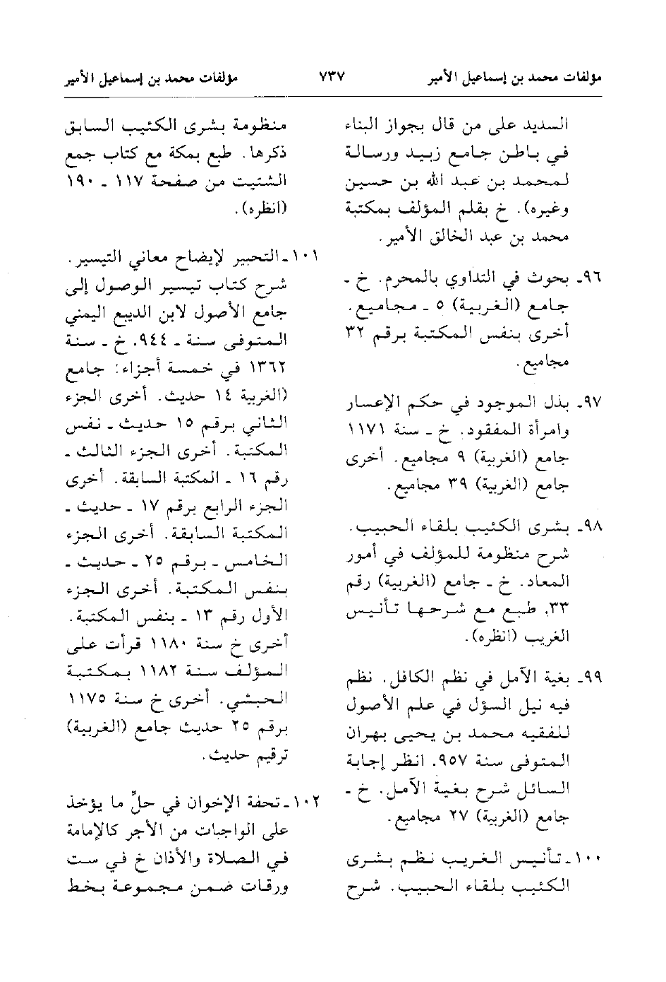97. بغية الآمل في نظم الكافل نظم فيه نيل السؤل في علم الأصول للفقيه محمد بن يحيى بهران المتوفى سنة 957 انظر إجابة السائل شرح بغية الآمل خ جامع الغربية 27 مجاميع.