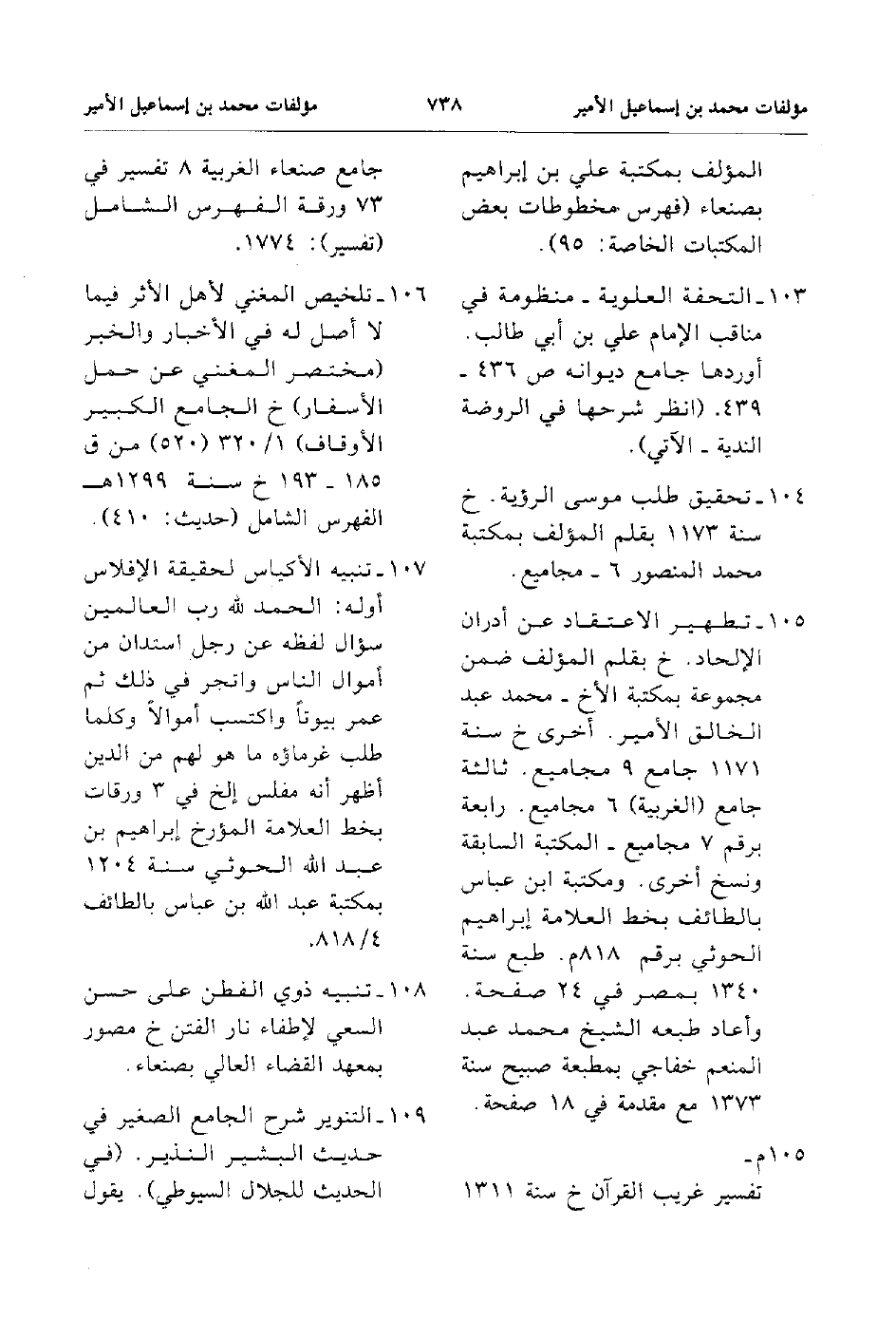 103. تطهير الاعتقاد عن ادران الإلحاد خ بقلم المؤلف ضمن مجموعة بمكتبة الأخ محمد عبد الخالق الأمير أخري خ سنة 1171 جامع 9 مجاميع ثالثة جامع الغربية 6 مجاميع رابعة برقم 7 مجاميع المكتبة السابقة ونسخ أخري ومكتبة ابن عباس بالطائف بخط العلامة ابراهيم الحوثي برقم 818م طبع سنة 1340 بمصر الشيخ محمد عبد المنعم خفاجي بمطبعة صبيح سنة 1373 مع مقدمة في 18 صفحة 105م.تفسير غريب القرآن خ سنة 1311 جامع صنعاء الغربية 8 تفسير في 73 ورقة الفهرس الشامل تفسير 1774.