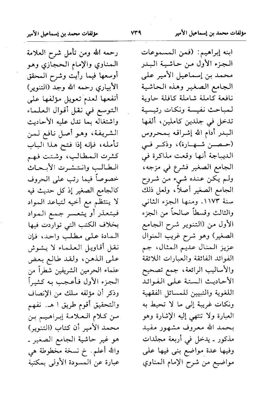ابنه إبراهيم فمن المسموعات الجزء الأول من حاشية البدر محمدبن اسماعيل الأمير على الجامع الصغير وهذه الحاشية نافعة كاملة شاملة كافلة حاوية لمباحث نفسية ونكات رئيسية تدخل في جلدين كاملين ألفها البدر أدام الله إشراقه بمحروس حصن شهارة وذكر في الديباجة الصغير فشرع في مزجه ولميكن عنده شئ من شروح الجامع الصغير صلاً ولعل ذلك سنة 1173 زمنها الجزء الأول من التنوير شرح الجامع الصغير وهو شرح غريب المنوال عزيز المنال عديم المثال جم الفوائد الفائقة والعبارات اللائقة والأساليب الرائعة جمع تصحيح الأحاديث السنة على لفوائد اللغوية والتبين للمسائل الفقهية ونكات غريبة إلى ما لا تحيط به العبارة ولا تنتهي إليه الإشارة وهو بحمد الله معروف مشهور مفيد مذكور يدخل في ارعة مجلدات وفيها عدة مواضع بنى فيها على مواضيع من شرح الإمام المناوي رحمه الله ومن تأمل شرح العلامة المناوي والإمام الحجازي وهو اوسعها فيما رأيت وشرح المحقق الأبياري رحمه الله وجد التنوير انفعها لعدم تعويل مؤلفها على التوسع في نقل أقوال العلماء واشتفاله بما تدل عليه الأحاديث الشريفة وهو أصل نافع لمن تأمله فإنه إذا فتح هذا الباب كثرت المطالب وشتت فهم الطالب وانتشرت الأبحاث خصوصا فيما رتب على الحروف كالجامع الصغير إذ كل حديث فيه لا ينتظم مع أخيه لتباعد المواد فيتعذر او يتعسر جمع المواد بخلاف الكتب التي توارت فيهاالمادة على مطلب واحد فإن نقل أقاويل العلماء لا يشوش على الذهن ولقد طالع بعض علماء الحرمين الشريفين شطرا من الجزء الأول فأعجب به كثيراً وذكر أن مؤلفه طريق 1هـ نفهم من كلام العلامة ابراهيم بن محمد الأمير أن كتاب التنوير هو غير حاشية الجامع الصغير والله اعلم خ نسهة مخطوطة هي عبارة عن المسودة الأولى بمكتبة .