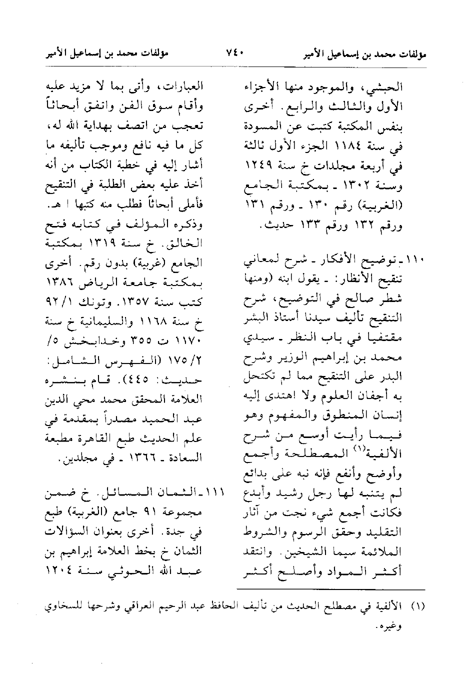 108. توضيح الأفكار شرح لمعاني تنقيح الأنظار يقول ابنه ومنها شطر صالح في التوضيح شرح التنقيح تأليف سيدنا أستاذ البشر مقتفيا في باب النظر سيدي محمد بن إبراهيم الوزير وشرح البدر على التنقيح مما لم تكتحل به أجفان العلوم ولا اهتدي إليه إنسان المنطوق والمفهوم وهو فيما رأيت أوسع من شرح الألفية المصطلحة وأجمع وأوضح وأنفع فإنه نبه على بدائع لم يتنبه لها رجل رشيد وأبدع لم يتنه لها رجل رشيد وأبدع فكانت أجمع شئ نجت من آثار التقليد وحقق الرسوم والشروط الملائمة سيما الشيخين وانتقد أكثر المواد وأصلح أكثر العبارات وأتى بما لا مزيد عليه وأقام سوق الفن واتفق أبحاثاً تعجب من اتصف بهداية الله له كل مافيه نافع وموجب تأليفه ما أشار إليه في خطبة الكتاب من أنه أخذ عليه بعض الطلبة في التنقيح فأملى أبحاثاُ فطلب منه كتبها 1 هـ وذكره المؤلف في كتابه فتح الخالق خ سنة 1319 بمكتبة الجامع غربية بدون رقم اخري بمكتبة جامعة الرياض 1386 كتب سنة 1357 وتونك 1/92 خ سنة 1168 والسليمانية خ سنة 1170ت 355 وخابخش 5/5/175 الفهرس الشامل حديث : 445 قام بنشره العلامة المحقق محمد محي الدين عبد الحميد مصدرا بمقدمة في علم الحديث طبع القاهرة مطبعة السعادة 1366 في مجلدين .