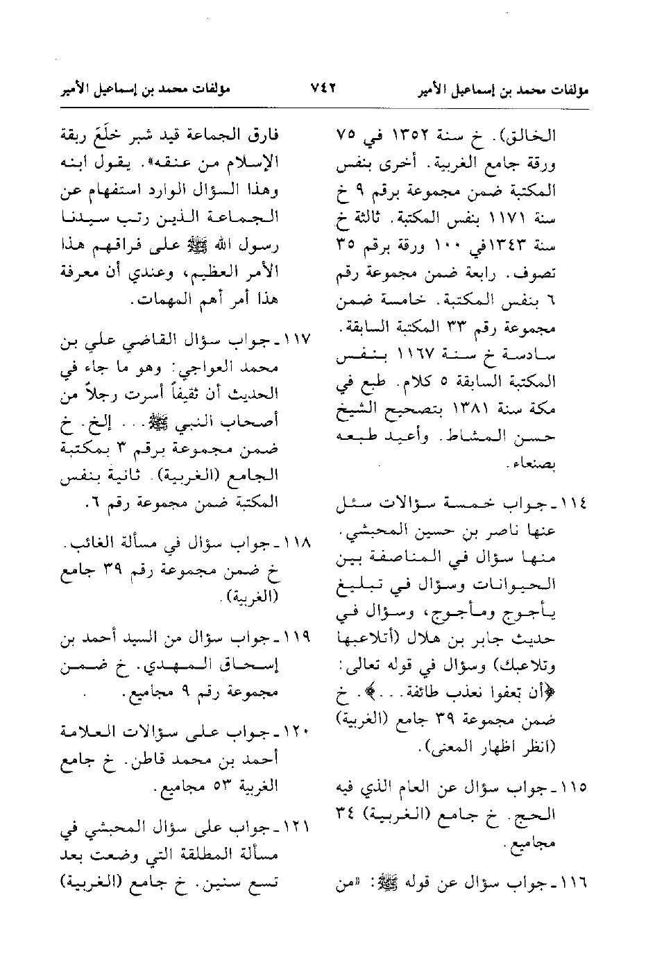 115. جواب سؤال القاضي علي بن محمد العواجي وهو ما جاء في الحديث ان ثقيفا اسرت رجلا من اصحا النبي صلى الله عليه و سلم ...الخ.خ ضمن مجموعة برقم 3 بمكتة الجامع الغربية ثانية بنفس المكتبة ضمن مجموعة رقم 6.