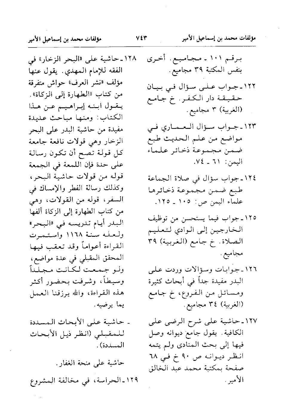 0126حاشية على (الحر الزخار)في الفقه للامام المهدي. يقول عنها مؤلف (نشر العرف)حواش متفرقة من كتا (الطهارة الى الزكاة) .يقول انه ابراهيم عن هذا الكتاب:ومنها مباحث عديدة مفيدة من حاشية البدر على البحر الزخار وهي قولات نافعة جامعة كل قولة تصح ان تكون رسالة على حدة فان اللمعة في الجمعة قولة من قولات حاشية البحر,وكذلك رسالة الفطر والأمساك في السفر,قوله من القولات,وهي من كتاب الطهارة الى الزكاة ألفها الدر أيام تدريسه في البحر ولعله سنة 1168 واستمرت القراءة اعواما وقد تعقب فيها المحقق المقبلي في عدة مواضع,ولوجمعت لكانت مجلدا وسيطا,وشرقت بحضور اكثر هذه القراءة ,والله يرزقنا العمل بما يرضيه