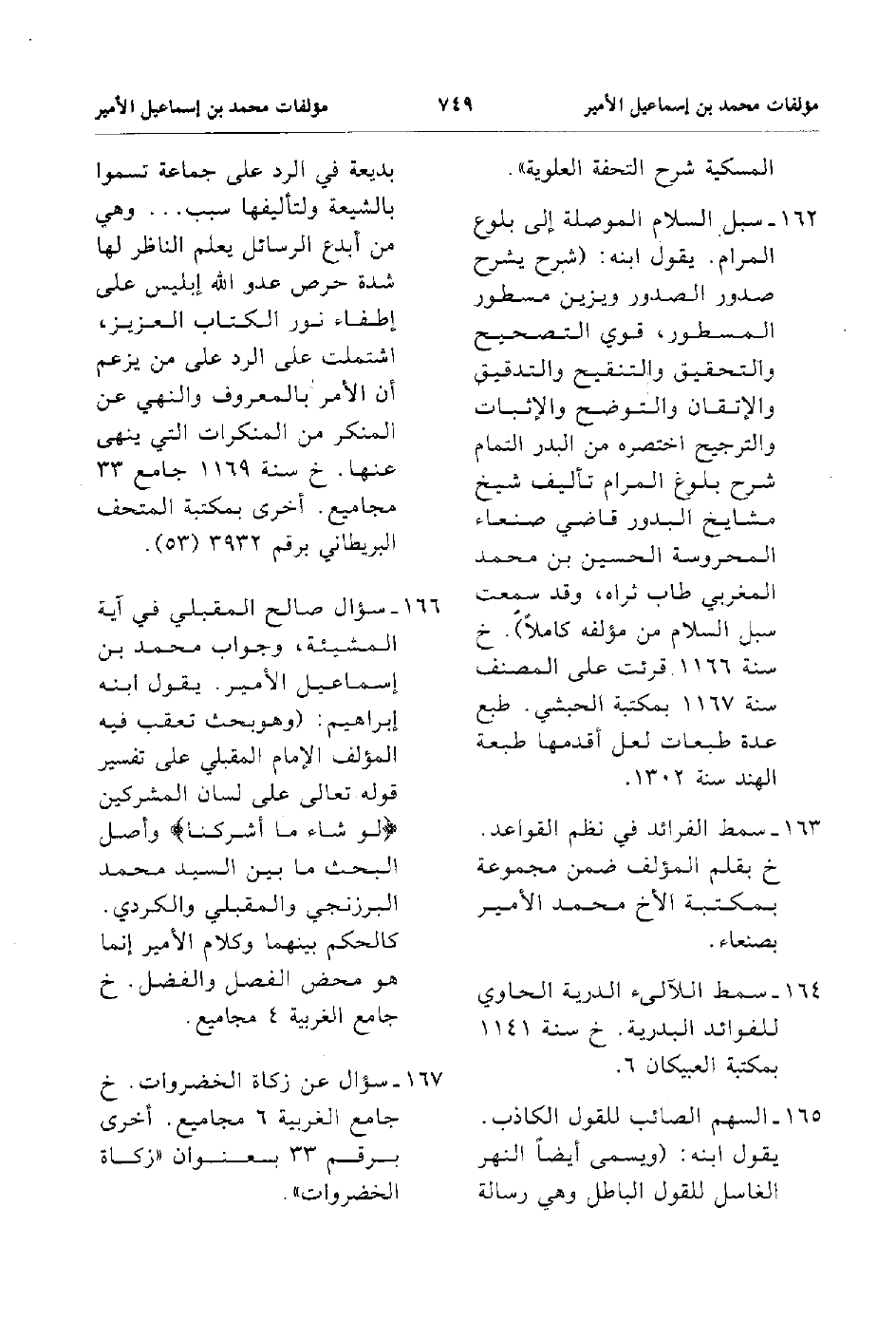 162. سبل السلام الموصلة إلى بلوع المرام يقول ابنه شرح يشرح صدور الصدور ويزين مسطور المسطور قوي التصحيح والتحقيق والتنقيح والتدقيق والاتقان والتوضح والإثبات والترجيح اختصره من البدر التمام شرح بلوغ المرام تأليف شيخ مشايخ البدور قاضي صنعاء المحروسة الحسين بن محمد المغربي طاب ثراه وقد سمعت سبل السلام من مؤلفه كاملا خ سنة 1166 قرئت على المصنف سنة 1167 بمكتبة الحبشي طبع عدة طبعات لعل أقدمها طبعة الهند سنة 1302.