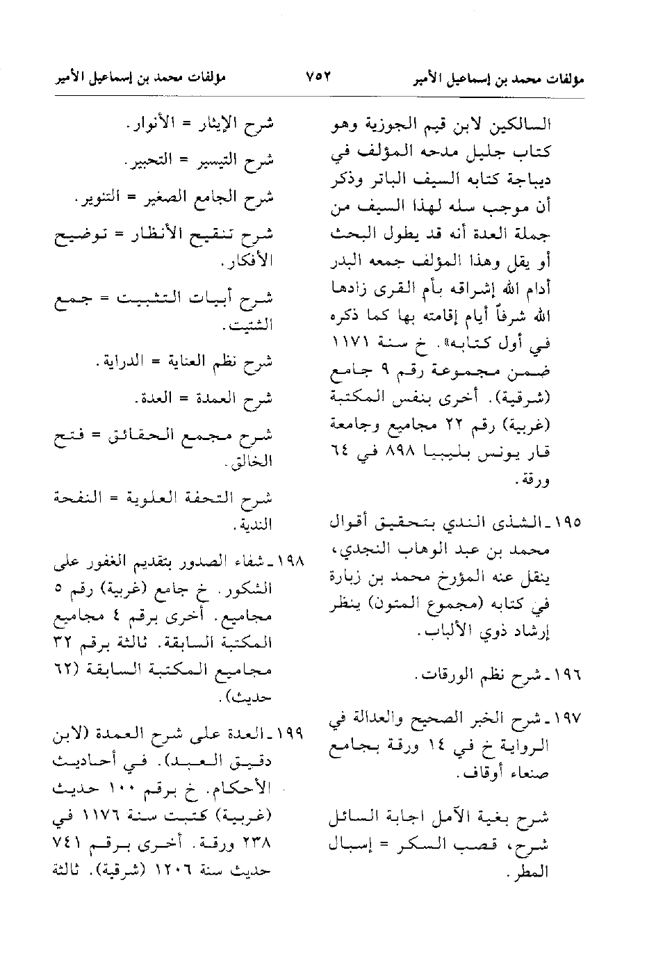 السالكين لابن قيم الجوزية وهو كتاب جليل مدحه المؤلف في ديباجة كتابه السيف الباتر وذكر ان موجب سله لهذا السيف من جملة العدة انه قد يطول البحث او يقل وهذا المؤلف جمعه البدر ادام الله اشراقه بام القري زادها الله شرفا ايام اقامته بها كما ذكره في اول كتابه خ سنة 1171 ضمن مجموعة رقم 9 جامع شرقية اخري بنفس المكتبة غربية رقم 22 مجاميع وجامعة قار يونس بليبيا 898 في 64 ورقة