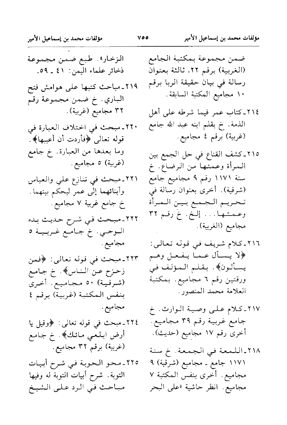 218. اللمعة في الجمعة خ سنة 1171 جامع مجاميع شرقية 9 مجاميع اخري بنفس المكتبة 7 مجاميع انظر حاشية على البحر الزخار طبع ضمن مجموعة ذخائر علماء اليمن 41-59.
