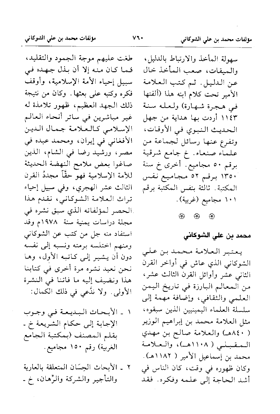 - يعتبر العلامة محمد بن علي اشوكاني الذي عاش في أواخر القرن الثاني عشر وأوائل القرن الثالث عشر من المعالم البارزة في تاريخ اليمن العلمي والثقافي وإضافة مهمة الى سلسلة العلماء اليمنيين الذين سبقوه مثل العلامة محمد بن إبراهيم الوزير 840هـ والعلامة صالح بن مهدي المقبلي 1108 هـ والعلامة محمد بن إسماعيل الأمير 1182هـ وكان ظهوره في وقت كان الناس في اشد الحاجة الى علمه وفكره فقد طغت عليهم موجة الجمود والتقليد فما كان منه الا أن بذل جهده في سبيل إحياء الأمة الإسلامية وأوقف فكره وكتبه على بعثها وكان من نتيجة ذلك الجهد العظيم ظهور تلامذة له غير مباشرين في سائر انحاء العالم الإسلامي كالعلامة جمال الدين الأفغاني في إيران ومحمد عبده في مصر ورشيد رضا في الشام الذين صاغوا بعض ملامح النهضة الحديثة للأمة الإسلامية فهو حقا مجدد القرن الثالث عشر الهجري وفي سبيل إحياء تراث العلامة الشوكاني تقدم هذا الحصر لمؤلفاته الذي سبق نشره في مجلة دراسات يمينة سنة 1978م وقد استفاد منه جل من كتب عن الشوكاني ومنهم اختلسه برمته ونسبه إلى نفسه ون ان يشير إلى كاتبه الأول وها نحن نعيد نشره مرة اخري في كتابنا هذا ونضيف إليه ما قاتنا في النشرة الأولى ولا ندعي في ذلك الكمال.