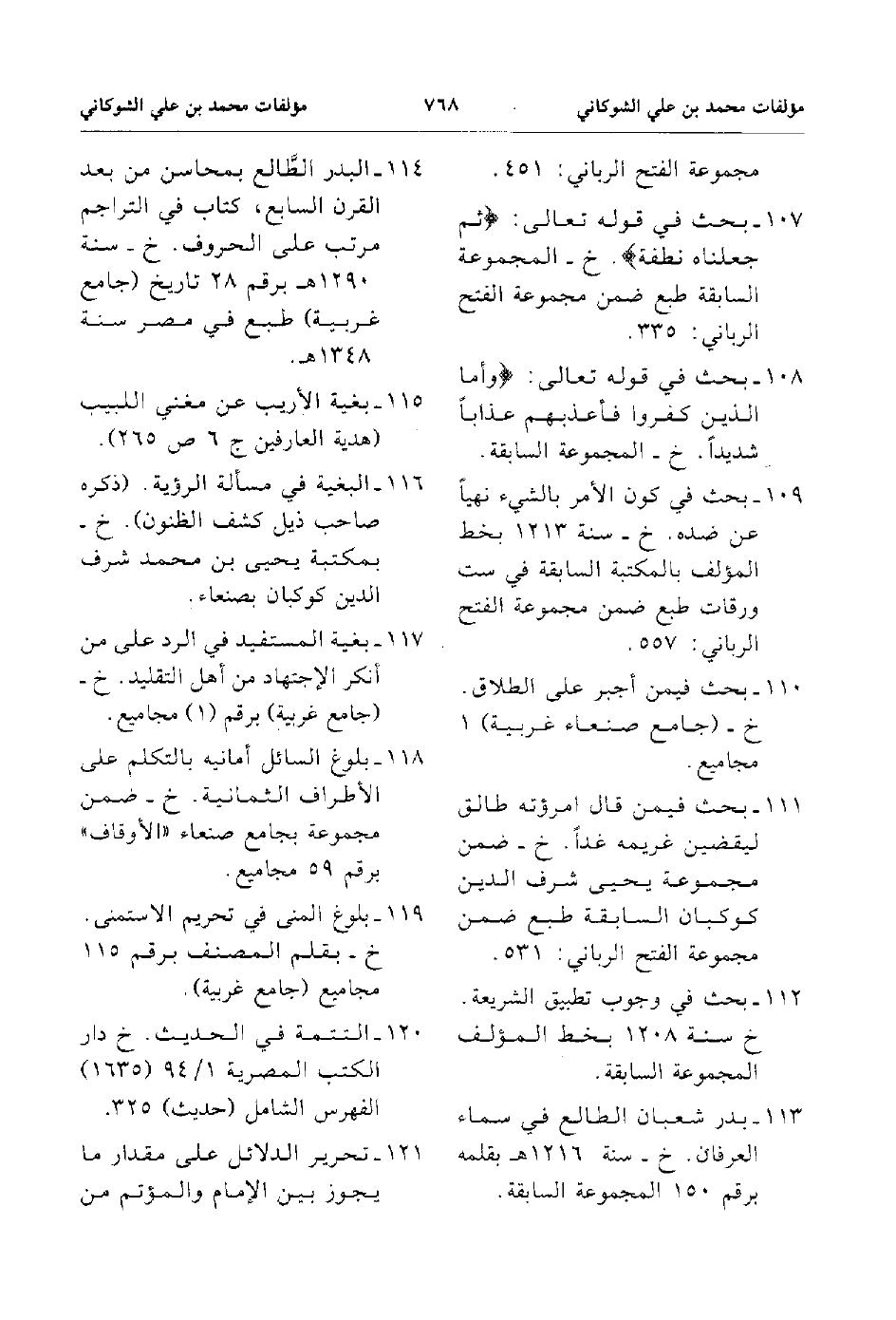 114. البدر الطالع بمحاسن من بعد القرن السابع كتاب في التراجم مرتب على الحروف خ سنة 1290هـ برقم 28 تاريخ جاع غرية طبع في مصر سنة 1348هـ .
