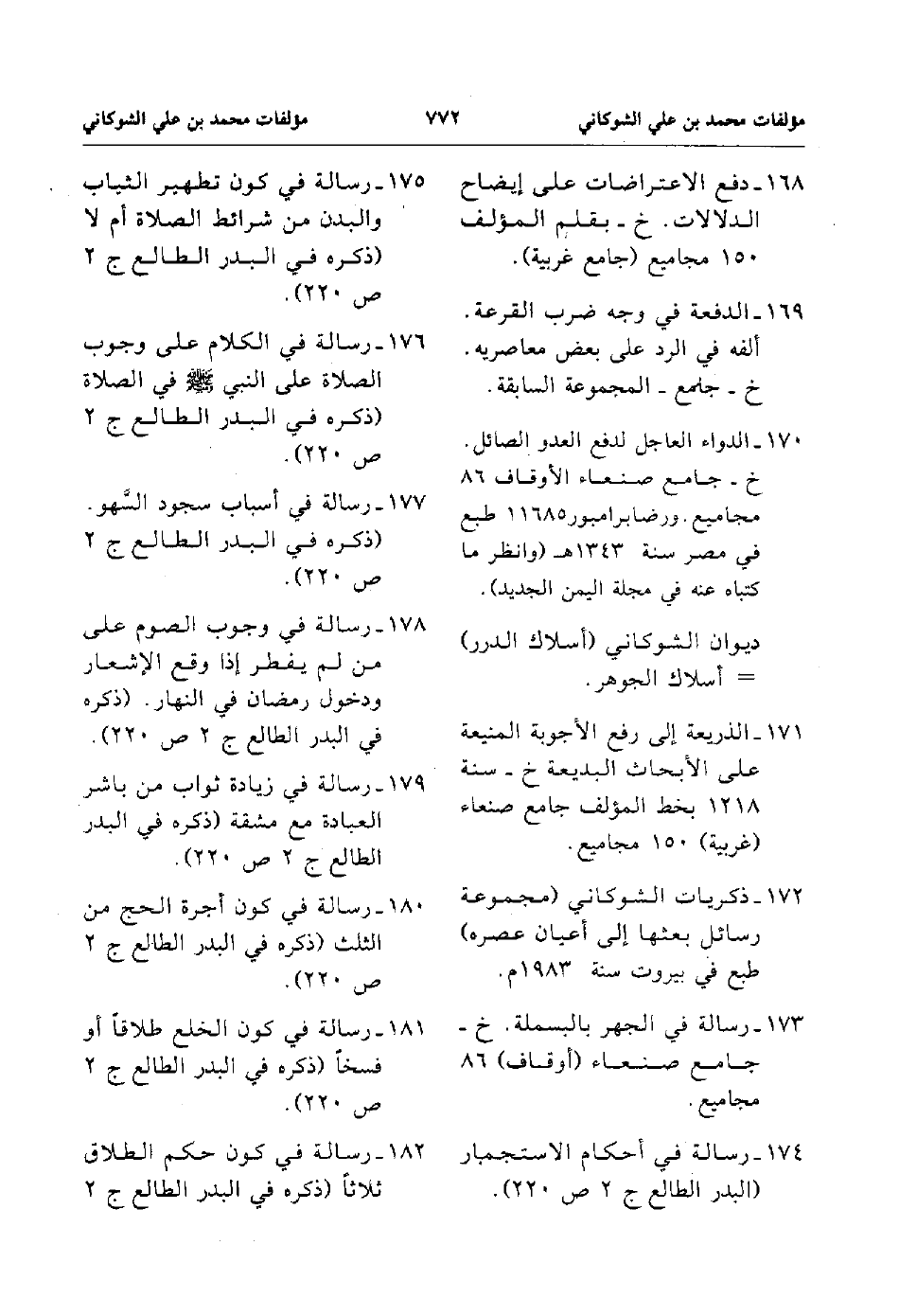 182. رسالة في كون حكم الطلاق ثلاثاًً ذكره في البدر الطالع ج 2 ص220
