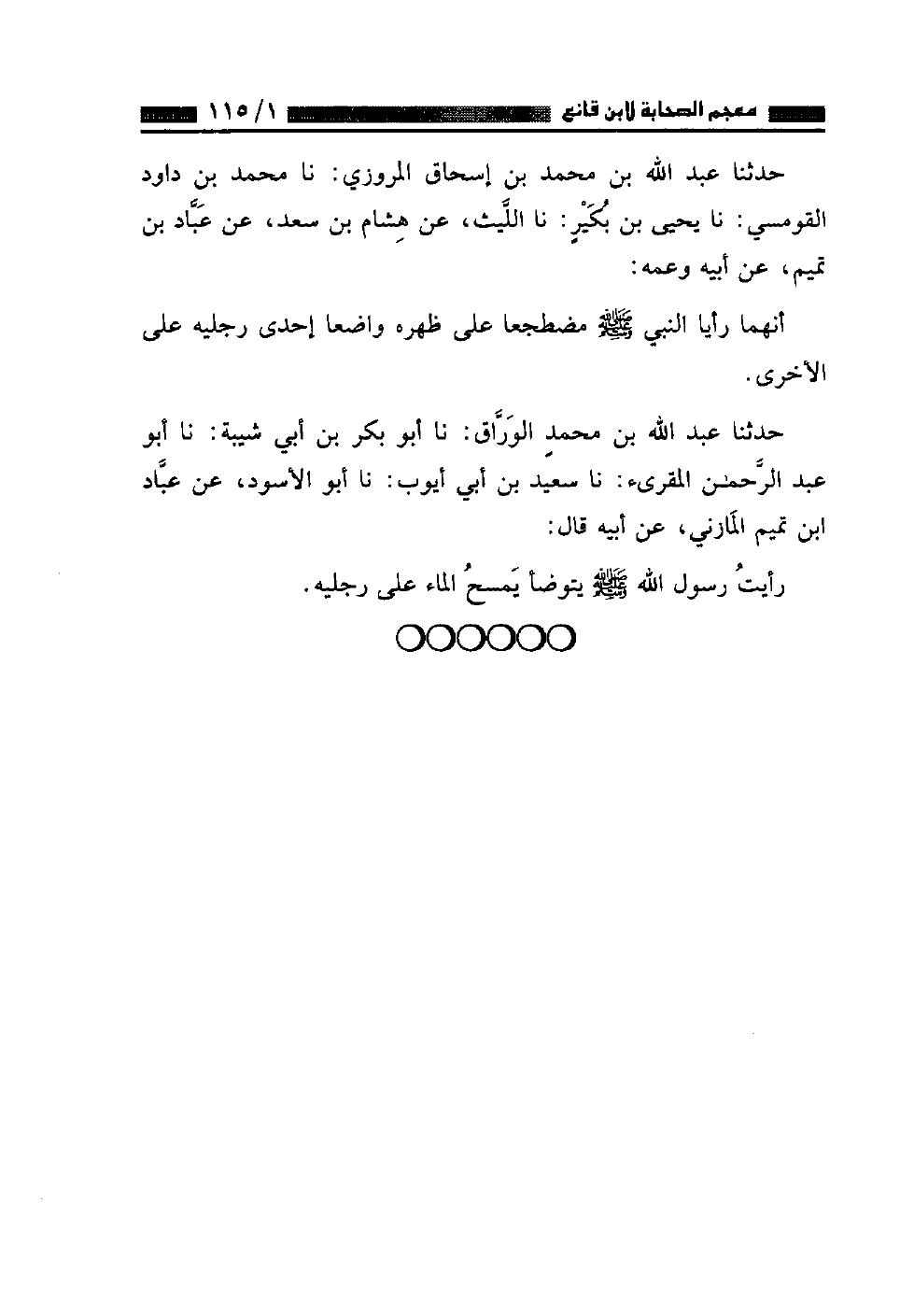 حَدَّثَنَا عَبْدُ اللَّهِ بْنُ مُحَمَّدٍ الْوَرَّاقُ، نا أَبُو بَكْرِ بْنُ أَبِي شَيْبَةَ، نا أَبُو عَبْدِ الرَّحْمَنِ الْمُقْرِئُ، نا سَعِيدُ بْنُ أَبِي أَيُّوبَ، نا أَبُو الْأَسْوَدِ، عَنْ عَبَّادِ بْنِ تَمِيمٍ الْمَازِنِيُّ، عَنْ أَبِيهِ قَالَ: «رَأَيْتُ رَسُولَ اللَّهِ صَلَّى اللهُ عَلَيْهِ وَسَلَّمَ يَتَوَضَّأُ يَمْسَحُ الْمَاءَ عَلَى رِجْلَيْهِ»