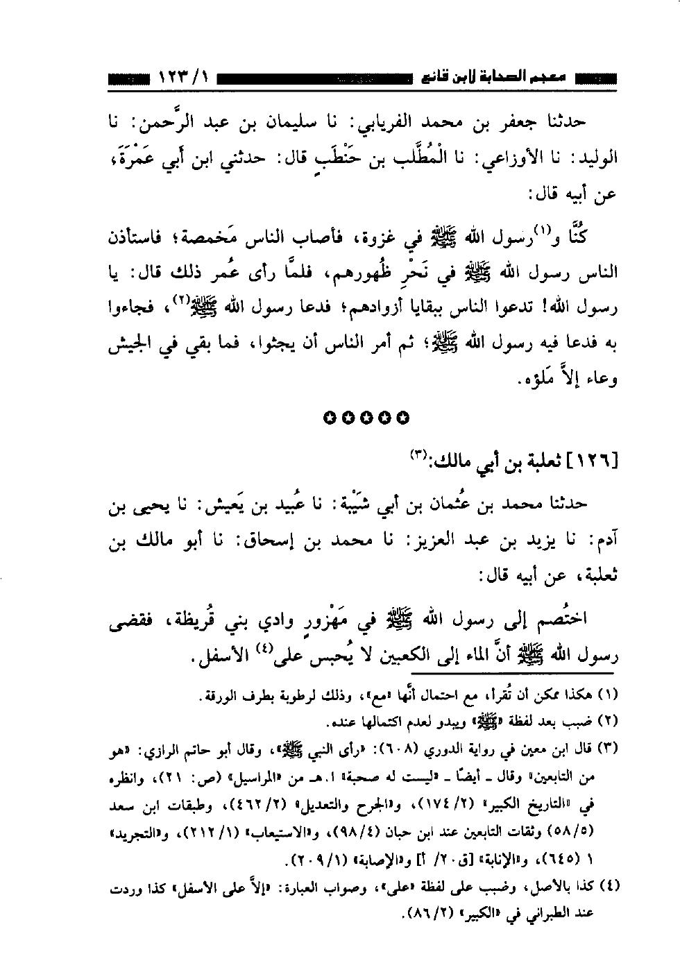 حَدَّثَنَا مُحَمَّدُ بْنُ عُثْمَانَ بْنِ أَبِي شَيْبَةَ، نا عُبَيْدُ بْنُ يَعِيشَ، نا يَحْيَى بْنُ آدَمَ، نا يَزِيدُ بْنُ عَبْدِ الْعَزِيزِ، نا مُحَمَّدُ بْنُ إِسْحَاقَ، نا أَبُو مَالِكِ بْنُ ثَعْلَبَةَ، عَنْ أَبِيهِ قَالَ اخْتُصِمَ إِلَى رَسُولِ اللَّهِ صَلَّى اللهُ عَلَيْهِ وَسَلَّمَ فِي مَهْزُورِ وَادِي بَنِي قُرَيْظَةَ «فَقَضَى رَسُولُ اللَّهِ صَلَّى اللهُ عَلَيْهِ وَسَلَّمَ أَنَّ الْمَاءَ إِلَى الْكَعْبَيْنِ لَا يُحْبَسُ عَلَى الْأَسْفَلِ»