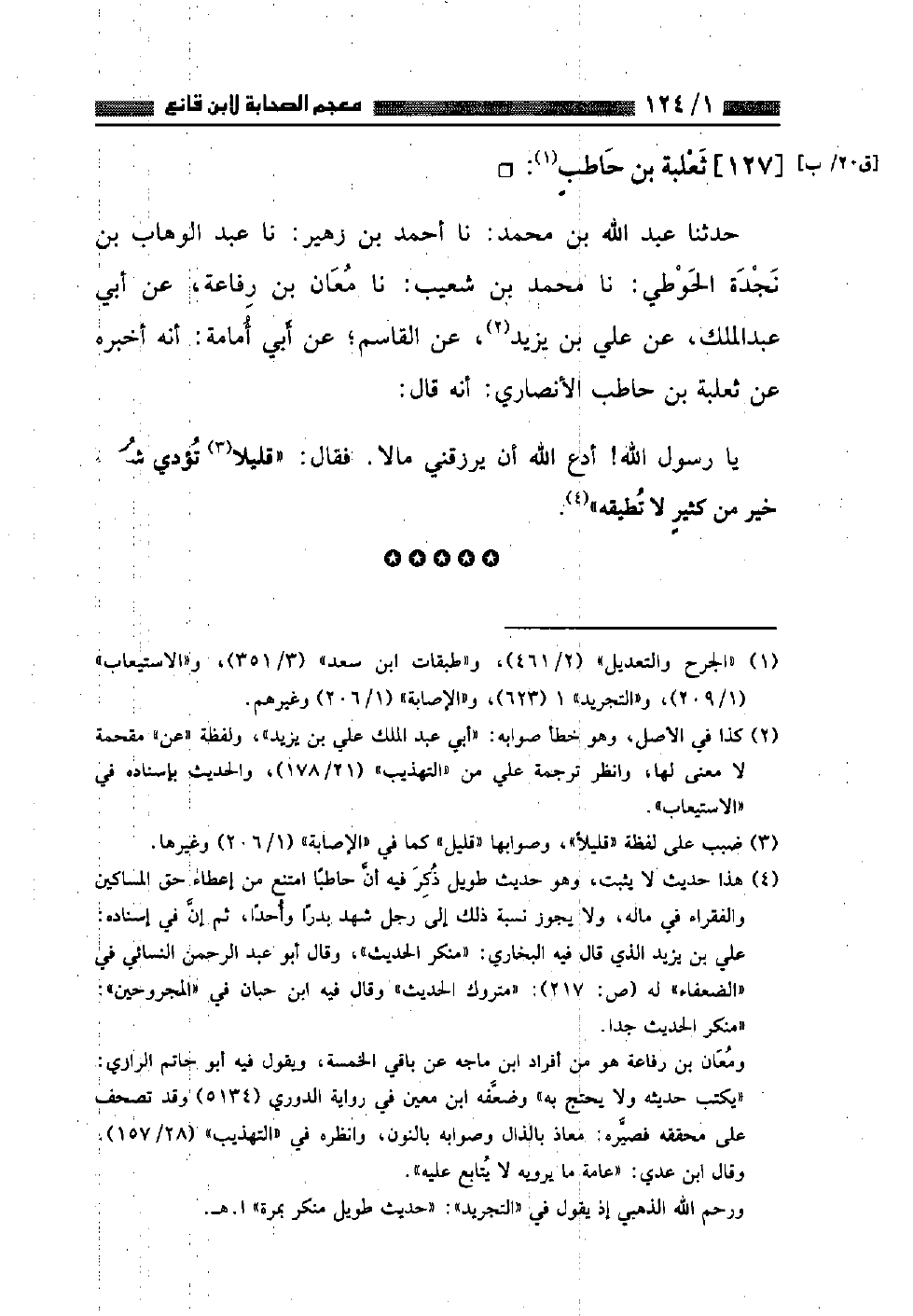 حَدَّثَنَا عَبْدُ اللَّهِ بْنُ مُحَمَّدٍ، نا أَحْمَدُ بْنُ زُهَيْرٍ، نا عَبْدُ الْوَهَّابِ بْنُ نَجْدَةَ الْحَوْطِيُّ، نا مُحَمَّدُ بْنُ شُعَيْبٍ، نا مُعَانُ بْنُ رِفَاعَةَ، عَنْ أَبِي عَبْدِ الْمَلِكِ، عَنْ عَلِيِّ بْنِ يَزِيدَ، عَنِ الْقَاسِمِ، عَنْ أَبِي أُمَامَةَ أَنَّهُ أَخْبَرَهُ عَنْ ثَعْلَبَةَ بْنِ حَاطِبٍ الْأَنْصَارِيِّ أَنَّهُ قَالَ: يَا رَسُولَ اللَّهِ ادْعُ اللَّهَ أَنْ يَرْزُقَنِي مَالًا فَقَالَ: «قَلِيلٌ تُؤَدِّي شَكْرَهُ خَيْرٌ مِنْ كَثِيرٍ لَا تُطِيقُهُ»