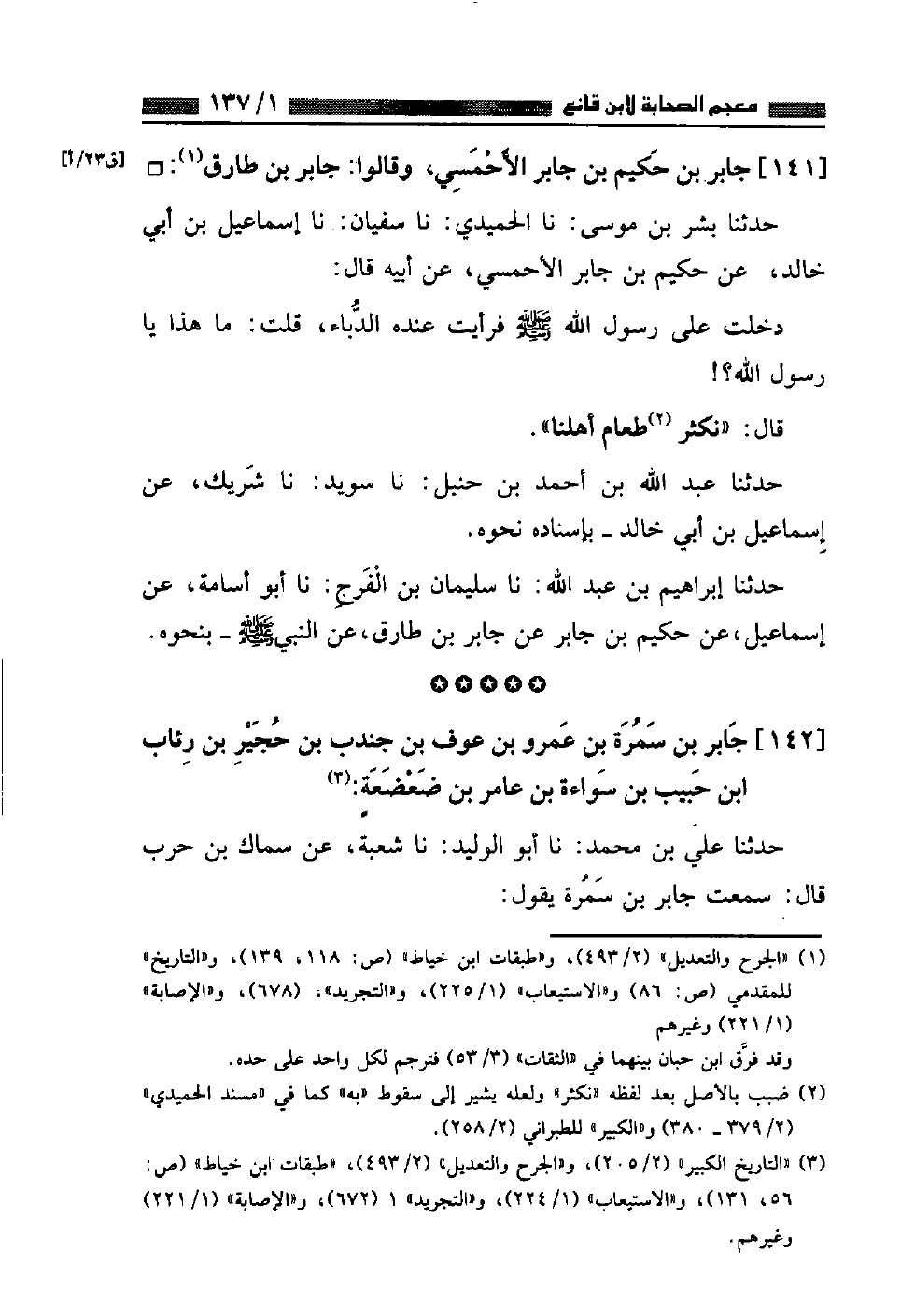 حَدَّثَنَا بِشْرُ بْنُ مُوسَى، نا الْحُمَيْدِيُّ، نا سُفْيَانُ، نا إِسْمَاعِيلُ بْنُ أَبِي خَالِدٍ، عَنْ حَكِيمِ بْنِ جَابِرٍ الْأَحْمَسِيِّ، عَنْ أَبِيهِ قَالَ: دَخَلْتُ عَلَى رَسُولِ اللَّهِ صَلَّى اللهُ عَلَيْهِ وَسَلَّمَ فَرَأَيْتُ عِنْدَهُ الدُّبَّاءَ قُلْتُ: مَا هَذَا يَا رَسُولَ اللَّهِ؟ قَالَ: «نُكَثِّرُ طَعَامَ أَهْلِنَا» حَدَّثَنَا عَبْدُ اللَّهِ بْنُ أَحْمَدَ بْنِ حَنْبَلٍ، نا سُوَيْدٌ، نا شَرِيكٌ، عَنْ إِسْمَاعِيلَ بْنِ أَبِي خَالِدٍ بِإِسْنَادِهِ نَحْوَهُ حَدَّثَنَا إِبْرَاهِيمُ بْنُ عَبْدِ اللَّهِ، نا سُلَيْمَانُ بْنُ الْفَرَجِ، نا أَبُو أُسَامَةَ، عَنْ إِسْمَاعِيلَ، عَنْ حَكِيمِ بْنِ جَابِرٍ، عَنْ جَابِرِ بْنِ طَارِقٍ عَنِ النَّبِيِّ صَلَّى اللهُ عَلَيْهِ وَسَلَّمَ بِنَحْوِهِ
