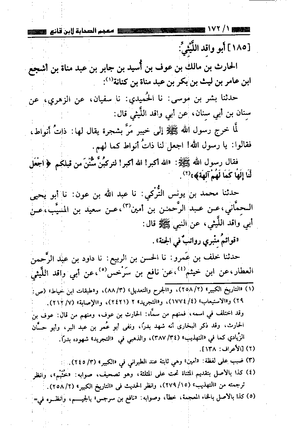 حَدَّثَنَا بِشْرُ بْنُ مُوسَى، نا الْحُمَيْدِيُّ، نا سُفْيَانُ، عَنِ الزُّهْرِيِّ، عَنْ سِنَانِ بْنِ أَبِي سِنَانٍ، عَنْ أَبِي وَاقِدٍ اللَّيْثِيِّ قَالَ: لَمَّا خَرَجَ رَسُولُ اللَّهِ صَلَّى اللهُ عَلَيْهِ وَسَلَّمَ إِلَى خَيْبَرَ مَرَّ بِشَجَرَةٍ يُقَالُ لَهَا ذَاتُ أَنْوَاطٍ فَقَالُوا: يَا رَسُولَ اللَّهِ اجْعَلْ لَنَا ذَاتَ أَنْوَاطٍ كَمَا لَهُمْ فَقَالَ رَسُولُ اللَّهِ صَلَّى اللهُ عَلَيْهِ وَسَلَّمَ: " اللَّهُ أَكْبَرُ اللَّهُ أَكْبَرُ لَتَرْكَبُنَّ سُنَنَ مَنْ قَبْلَكُمُ {اجْعَلْ لَنَا إِلَهًا كَمَا لَهُمْ آلِهَةٌ} [الأعراف: ١٣٨] "