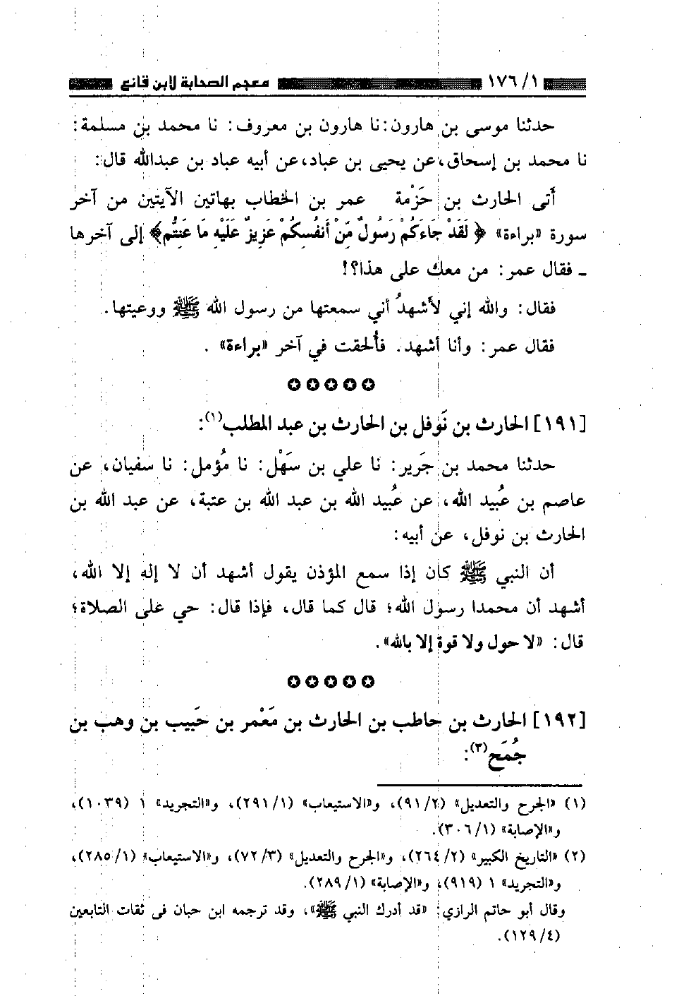 حَدَّثَنَا مُوسَى بْنُ هَارُونَ، نا هَارُونُ بْنُ مَعْرُوفٍ، نا مُحَمَّدُ بْنُ مَسْلَمَةَ، نا مُحَمَّدُ بْنُ إِسْحَاقَ، عَنْ يَحْيَى بْنِ عَبَّادٍ، عَنْ أَبِيهِ عَبَّادِ بْنِ عَبْدِ اللَّهِ قَالَ: " أَتَى الْحَارِثُ بْنُ خَزَمَةَ عُمَرَ بْنَ الْخَطَّابِ بِهَاتَيْنِ الآيَتَيْنِ مِنْ آخِرِ سُورَةِ بَرَاءَةَ {لَقَدْ جَاءَكُمْ رَسُولٌ مِنْ أَنْفُسِكُمْ عَزِيزٌ عَلَيْهِ مَا عَنِتُّمْ} [التوبة: ١٢٨] إِلَى آخِرِهَا فَقَالَ عُمَرُ: مَنْ مَعَكَ عَلَى هَذَا؟ فَقَالَ: وَاللَّهِ إِنِّي لَأَشْهَدُ أَنِّي سَمِعْتُهَا مِنْ رَسُولِ اللَّهِ صَلَّى اللهُ عَلَيْهِ وَسَلَّمَ وَوَعَيْتُهَا، فَقَالَ عُمَرُ: وَأَنَا أَشْهَدُ، فَأُلْحِقَتْ فِي آخِرِ بَرَاءَةَ "