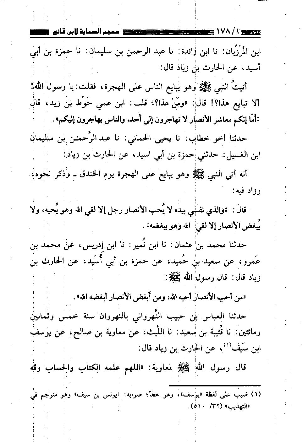 حَدَّثَنَا الْعَبَّاسُ بْنُ حَبِيبٍ النَّهْرَوَانِيُّ بِالنَّهْرَوَانِ سَنَةَ خَمْسٍ وَثَمَانِينَ وَمِائَتَيْنِ، نا قُتَيْبَةُ بْنُ سَعِيدٍ، نا اللَّيْثُ، عَنْ مُعَاوِيَةَ بْنِ صَالِحٍ، عَنْ يُوسُفَ بْنِ سَيْفٍ، عَنِ الْحَارِثِ بْنِ زِيَادٍ قَالَ: قَالَ رَسُولُ اللَّهِ صَلَّى اللهُ عَلَيْهِ وَسَلَّمَ لِمُعَاوِيَةَ: «اللَّهُمَّ عَلِّمْهُ الْكِتَابَ وَالْحِسَابَ وَقِهِ ⦗١٧٩⦘ الْعَذَابَ»