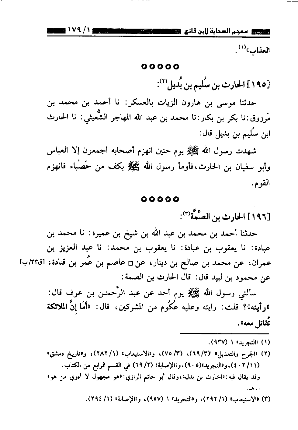 حَدَّثَنَا مُوسَى بْنُ هَارُونَ الزَّيَّاتُ بِالْعَسْكَرِ نا أَحْمَدُ بْنُ مُحَمَّدِ بْنِ مَرْزُوقٍ، نا بَكْرُ بْنُ بَكَّارٍ، نا مُحَمَّدُ بْنُ عَبْدِ اللَّهِ الْمُهَاجِرُ الشُّعَيْثِيُّ، نا الْحَارِثُ بْنُ سُلَيْمِ بْنِ بُدَيْلٍ قَالَ: «شَهِدْتُ رَسُولَ اللَّهِ صَلَّى اللهُ عَلَيْهِ وَسَلَّمَ يَوْمَ حُنَيْنٍ انْهَزَمَ أَصْحَابُهُ أَجْمَعُونَ إِلَّا الْعَبَّاسَ وَأَبَا سُفْيَانَ بْنَ الْحَارِثِ فَأَوْمَأَ رَسُولُ اللَّهِ صَلَّى اللهُ عَلَيْهِ وَسَلَّمَ بِكَفٍّ مِنْ حَصْبَاءَ فَانْهَزَمَ الْقَوْمُ»