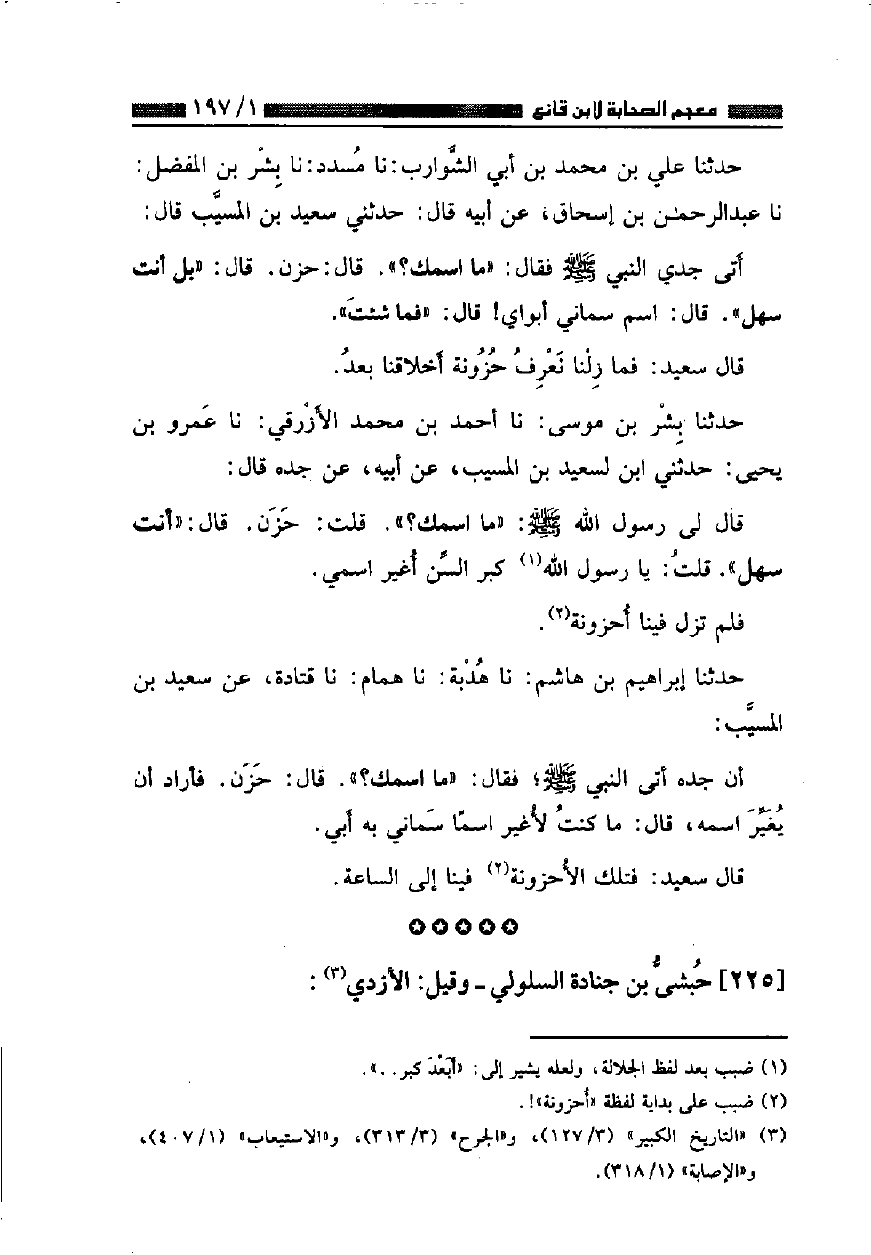 حَدَّثَنَا إِبْرَاهِيمُ بْنُ هَاشِمٍ، نا هُدْبَةُ، نا هَمَّامٌ، نا قَتَادَةُ، عَنْ سَعِيدِ بْنِ الْمُسَيِّبِ، أَنَّ جَدَّهُ أَتَى النَّبِيَّ صَلَّى اللهُ عَلَيْهِ وَسَلَّمَ فَقَالَ: «مَا اسْمُكَ؟» قَالَ: حَزْنٌ فَأَرَادَ أَنْ يُغَيِّرَ اسْمَهُ قَالَ: مَا كُنْتُ لِأُغَيِّرُ اسْمًا سَمَّانِي بِهِ أَبِي، قَالَ سَعِيدٌ فَتِلْكَ الْأُحْزُونَةُ فِينَا إِلَى السَّاعَةِ