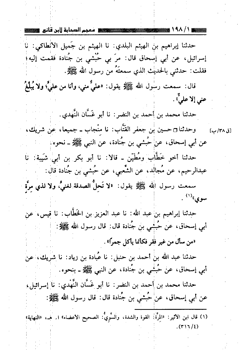 حَدَّثَنَا إِبْرَاهِيمُ بْنُ عَبْدِ اللَّهِ، نا عَبْدُ الْعَزِيزِ بْنُ الْخَطَّابِ، نا قَيْسٌ، عَنْ أَبِي إِسْحَاقَ، عَنْ حَبَشِيِّ بْنِ جُنَادَةَ قَالَ: قَالَ رَسُولُ اللَّهِ صَلَّى اللهُ عَلَيْهِ وَسَلَّمَ: «مَنْ سَأَلَ مِنْ غَيْرِ فَقْرٍ فَكَأَنَّمَا يَأْكُلُ جَمْرًا» حَدَّثَنَا عَبْدُ اللَّهِ بْنُ أَحْمَدَ بْنِ حَنْبَلٍ، نا عُبَادَةُ بْنُ زِيَادٍ، نا شَرِيكٌ، عَنْ أَبِي إِسْحَاقَ، عَنْ حَبَشِيِّ بْنِ جُنَادَةَ عَنِ النَّبِيِّ صَلَّى اللهُ عَلَيْهِ وَسَلَّمَ بِنَحْوِهِ