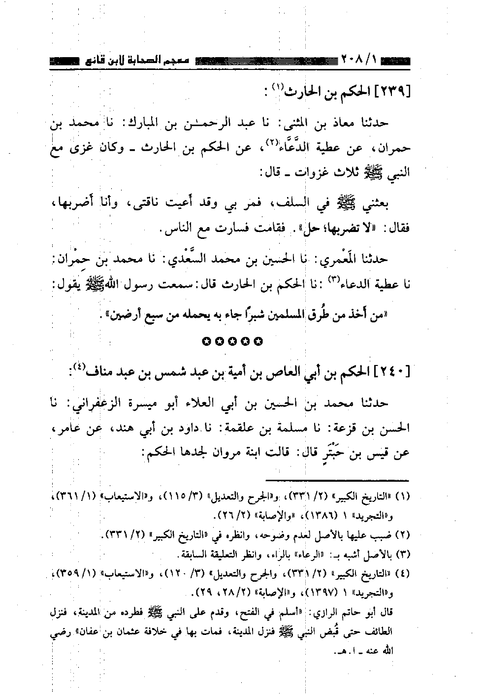 حَدَّثَنَا مُعَاذُ بْنُ الْمُثَنَّى، نا عَبْدُ الرَّحْمَنِ بْنُ الْمُبَارَكِ، نا مُحَمَّدُ بْنُ حُمْرَانَ، عَنْ عَطِيَّةَ الدُّعَاءِ، عَنِ الْحَكَمِ بْنِ الْحَارِثِ , وَكَانَ غَزَى مَعَ النَّبِيِّ صَلَّى اللهُ عَلَيْهِ وَسَلَّمَ ثَلَاثَ غَزَوَاتٍ، قَالَ: بَعَثَنِي صَلَّى اللهُ عَلَيْهِ وَسَلَّمَ فِي السَّلَفِ فَمَرَّ بِي وَقَدْ أَعْيَتْ نَاقَتِي وَأَنَا أَضْرِبُهَا فَقَالَ: «لَا تَضْرِبْهَا حُلَّ» فَقَامَتْ فَسَارَتْ مَعَ النَّاسِ
