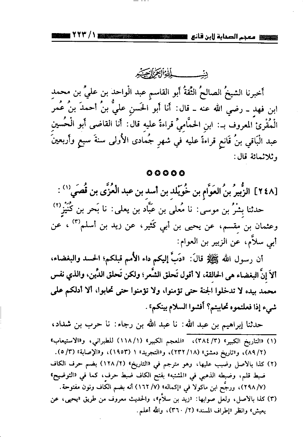 أَخْبَرَنَا الشَّيْخُ الصَّالِحُ الثَّقَةُ أَبُو الْقَاسِمِ عَبْدُ الْوَاحِدِ بْنُ عَلَيِّ بْنِ مُحَمَّدِ بْنِ فَهْدٍ رَضِيَ اللَّهُ عَنْهُ قَالَ: أَنَا أَبُو الْحَسَنِ عَلِيُّ بْنُ أَحْمَدَ بْنِ عُمَرَ الْمُقْرِئُ الْمَعْرُوفُ بِابْنِ الْحِمَامِيِّ قِرَاءَةً عَلَيْهِ قَالَ: أَنَا الْقَاضِي أَبُو الْحُسَيْنِ عَبْدُ الْبَاقِي بْنُ قَانِعٍ قِرَاءَةً عَلَيْهِ فِي شَهْرِ جُمَادَى الْأُولَى سَنَةَ سَبْعٍ وَأَرْبَعِينَ وَثَلَاثِمِائَةٍ قَالَ: حَدَّثَنَا بِشْرُ بْنُ مُوسَى، نا مُعَلَّى بْنُ عَبَّادِ بْنِ يَعْلَى، نا بَحْرُ بْنُ كَنِيزٍ، وَعُثْمَانُ بْنُ مِقْسَمٍ، عَنْ يَحْيَى بْنِ أَبِي كَثِيرٍ، عَنْ زَيْدِ بْنِ أَسْلَمَ، عَنْ أَبِي سَلَّامٍ، عَنِ الزُّبَيْرِ بْنِ الْعَوَّامِ أَنَّ رَسُولَ اللَّهِ صَلَّى اللهُ عَلَيْهِ وَسَلَّمَ قَالَ: «دَبَّ إِلَيْكُمْ دَاءُ الْأُمَمِ قَبْلَكُمُ الْحَسَدُ وَالْبَغْضَاءُ أَلَا إِنَّ الْبَغْضَاءَ هِيَ الْحَالِقَةُ لَا أَقُولُ تَحْلِقُ الشَّعْرَ وَلَكِنْ تَحْلِقُ الدِّينَ وَالَّذِي نَفْسُ مُحَمَّدٍ بِيَدِهِ لَا تَدْخُلُوا الْجَنَّةَ حَتَّى تُؤْمِنُوا وَلَا تُؤْمِنُوا حَتَّى تَحَابُّوا أَلَا أَدُلُّكُمْ عَلَى شَيْءٍ إِذَا فَعَلْتُمُوهُ تَحَابَبْتُمْ أَفْشُوا السَّلَامَ بَيْنَكُمْ» حَدَّثَنَا إِبْرَاهِيمُ بْنُ عَبْدِ اللَّهِ، نا عَبْدُ اللَّهِ بْنُ رَجَاءَ، نا حَرْبُ بْنُ شَدَّادٍ ⦗٢٢٤⦘، عَنْ يَحْيَى بْنِ أَبِي كَثِيرٍ قَالَ: حَدَّثَنِي يَعِيشُ بْنُ الْوَلِيدِ بْنِ هِشَامٍ، أَنَّ مَوْلًى لِابْنِ الزُّبَيْرِ حَدَّثَهُ أَنَّ الزُّبَيْرَ حَدَّثَهُ عَنْ رَسُولِ اللَّهِ صَلَّى اللهُ عَلَيْهِ وَسَلَّمَ قَالَ: «دَبَّ إِلَيْكُمْ دَاءُ الْأُمَمِ قَبْلَكُمُ الْحَسَدُ وَالْبَغْضَاءُ» وَذَكَرَ نَحْوَهُ