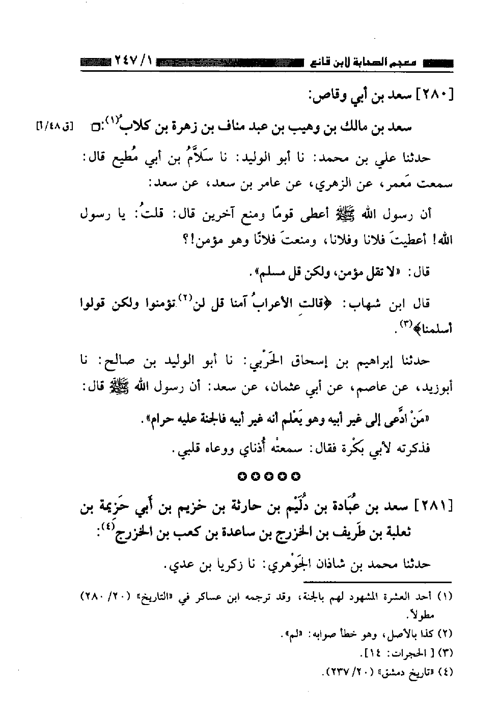 حَدَّثَنَا عَلِيُّ بْنُ مُحَمَّدٍ، نا أَبُو الْوَلِيدِ، نا سَلَّامُ بْنُ أَبِي مُطِيعٍ قَالَ: سَمِعْتُ مَعْمَرًا، عَنِ الزُّهْرِيِّ، عَنْ عَامِرِ بْنِ سَعْدٍ، عَنْ سَعْدٍ أَنَّ رَسُولَ اللَّهِ صَلَّى اللهُ عَلَيْهِ وَسَلَّمَ أَعْطَى قَوْمًا وَمَنَعَ آخَرِينَ قَالَ: قُلْتُ: يَا رَسُولَ اللَّهِ أَعْطَيْتَ فُلَانًا وَفُلَانًا وَمَنَعْتَ فُلَانًا وَهُوَ مُؤْمِنٌ، قَالَ: «لَا تَقُلْ مُؤْمِنٌ وَلَكِنْ قُلْ مُسْلِمٌ» قَالَ ابْنُ شِهَابٍ: قَالَتِ الْأَعْرَابُ آمَنَّا قُلْ لَمْ تُؤْمِنُوا وَلَكِنْ قُولُوا أَسْلَمْنَا