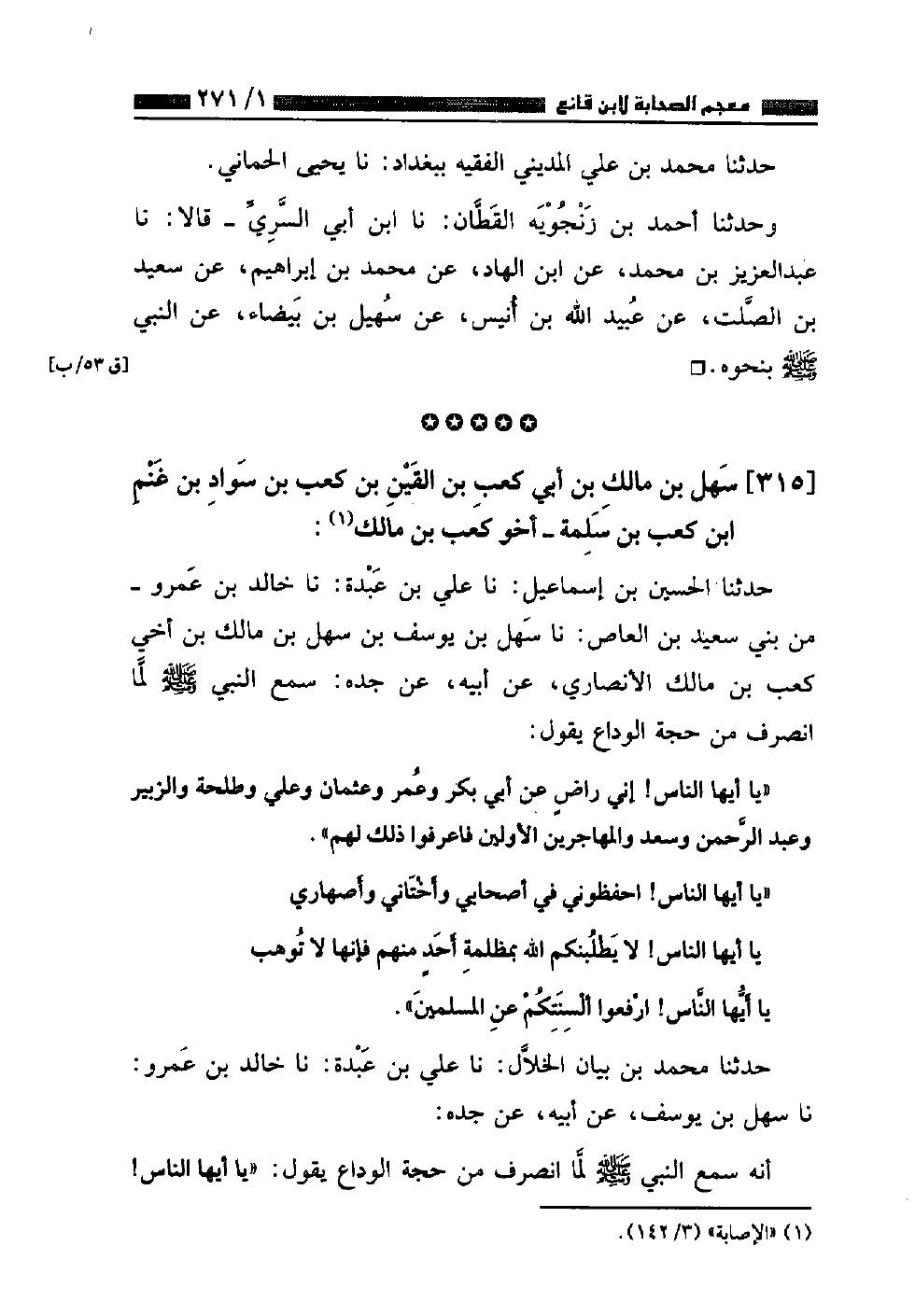حَدَّثَنَا الْحُسَيْنُ بْنُ إِسْمَاعِيلَ، نا عَلِيُّ بْنُ عَبْدَةَ، نا خَالِدُ بْنُ عَمْرٍو مِنْ بَنِي سَعِيدِ بْنِ الْعَاصِ، نا سَهْلُ بْنُ يُوسُفَ بْنِ سَهْلِ بْنِ مَالِكِ ابْنِ أَخِي كَعْبِ بْنِ مَالِكٍ الْأَنْصَارِيُّ عَنْ أَبِيهِ، عَنْ جَدِّهِ، سَمِعَ النَّبِيَّ صَلَّى اللهُ عَلَيْهِ وَسَلَّمَ لَمَّا انْصَرَفَ مِنْ حَجَّةِ الْوَدَاعِ يَقُولُ: «يَا أَيُّهَا النَّاسُ إِنِّي رَاضٍ عَنْ أَبِي بَكْرٍ وَعُمَرَ وَعُثْمَانَ وَعَلِيٍّ وَطَلْحَةَ وَالزُّبَيْرِ وَعَبْدِ الرَّحْمَنِ وَسَعْدٍ وَالْمُهَاجِرِينَ الْأَوَّلِينَ فَاعْرِفُوا ذَلِكَ لَهُمْ، يَا أَيُّهَا النَّاسُ احْفَظُونِي فِي أَصْحَابِي وَأَخْتَانِي وَأَصْهَارِي، يَا أَيُّهَا النَّاسُ لَا يَطْلُبَنَّكُمُ اللَّهُ بِمَظْلِمَةِ أَحَدٍ مِنْهُمْ فَإِنَّهَا لَا تُوهَبُ، يَا أَيُّهَا النَّاسُ ارْفَعُوا أَلْسِنَتَكُمْ عَنِ الْمُسْلِمِينَ» حَدَّثَنَا مُحَمَّدُ بْنُ بَيَانٍ الْخَلَّالُ، نا عَلِيُّ بْنُ عَبْدَةَ، نا خَالِدُ بْنُ عَمْرٍو، نا سَهْلُ بْنُ يُوسُفَ، عَنْ أَبِيهِ، عَنْ جَدِّهِ، أَنَّهُ سَمِعَ النَّبِيَّ صَلَّى اللهُ عَلَيْهِ وَسَلَّمَ لَمَّا انْصَرَفَ مِنْ حَجَّةِ الْوَدَاعِ يَقُولُ: «يَا أَيُّهَا النَّاسُ