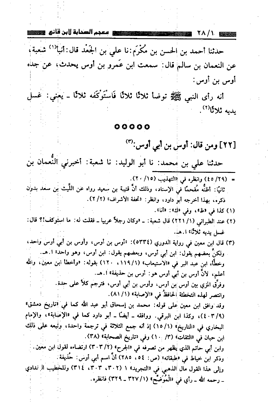 حَدَّثَنَا أَحْمَدُ بْنُ الْحَسَنِ بْنِ مُكْرَمٍ، نا عَلِيُّ بْنُ الْجَعْدِ قَالَ: أَنْبَأَ شُعْبَةُ، عَنِ النُّعْمَانِ بْنِ سَالِمٍ قَالَ سَمِعْتُ ابْنَ عَمْرِو بْنِ أَوْسٍ يُحَدِّثُ , عَنْ جَدِّهِ أَوْسِ بْنِ أَوْسٍ أَنَّهُ «رَأَى النَّبِيَّ صَلَّى اللهُ عَلَيْهِ وَسَلَّمَ تَوَضَّأَ ثَلَاثًا ثَلَاثًا فَاسْتَوْكَفَهُ ثَلَاثًا» يَعْنِي غَسَلَ يَدَيْهِ ثَلَاثًا