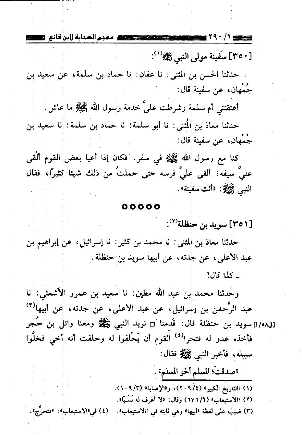 حَدَّثَنَا مُعَاذُ بْنُ الْمُثَنَّى، نا أَبُو سَلَمَةَ، نا حَمَّادُ بْنُ سَلَمَةَ، نا سَعِيدُ بْنُ جُمْهَانَ، عَنْ سَفِينَةَ قَالَ: كُنَّا مَعَ رَسُولِ اللَّهِ صَلَّى اللهُ عَلَيْهِ وَسَلَّمَ فِي سَفَرٍ فَكَانَ إِذَا أَعْيَا بَعْضُ الْقَوْمِ أَلْقَى عَلَيَّ سَيْفَهُ أَلْقَى عَلَيَّ فَرَسَهُ حَتَّى حَمَلْتُ مِنْ ذَلِكَ شَيْئًا كَثِيرًا فَقَالَ النَّبِيُّ صَلَّى اللهُ عَلَيْهِ وَسَلَّمَ: «أَنْتَ سَفِينَةُ»