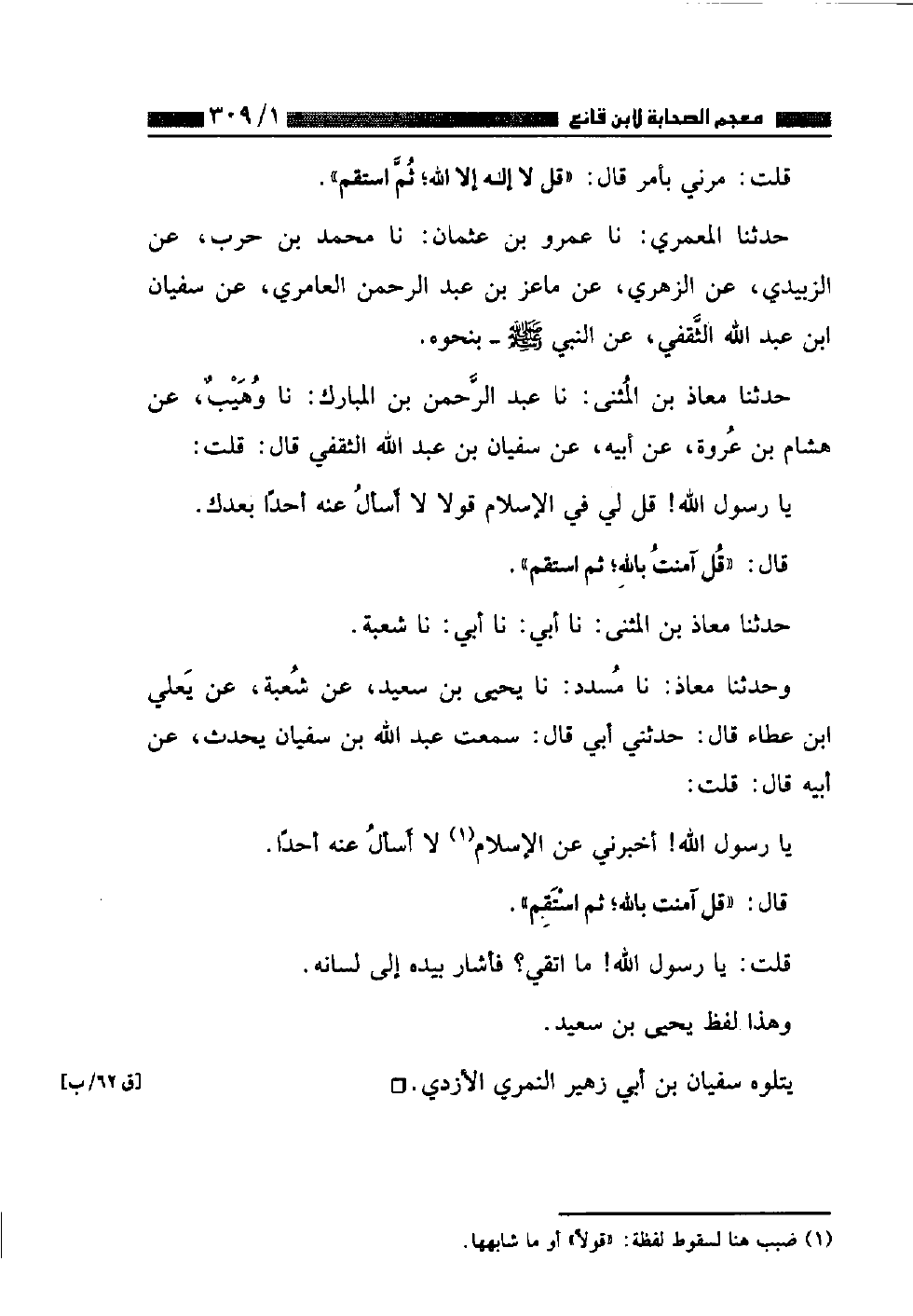 حَدَّثَنَا مُعَاذُ بْنُ الْمُثَنَّى، نا عَبْدُ الرَّحْمَنِ بْنُ الْمُبَارَكِ، نا وُهَيْبٌ، عَنْ هِشَامِ بْنِ عُرْوَةَ، عَنْ أَبِيهِ، عَنْ سُفْيَانَ بْنِ عَبْدِ اللَّهِ الثَّقَفِيِّ قَالَ قُلْتُ: يَا رَسُولَ اللَّهِ قُلْ لِي فِي الْإِسْلَامِ قَوْلًا لَا أَسْأَلُ عَنْهُ أَحَدًا بَعْدَكَ، قَالَ: «قُلْ آمَنْتُ بِاللَّهِ ثُمَّ اسْتَقِمْ»