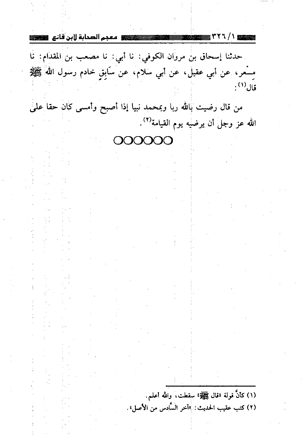 حَدَّثَنَا إِسْحَاقُ بْنُ مَرْوَانَ الْكُوفِيُّ، نا أَبِي، نا مُصْعَبُ بْنُ الْمِقْدَامِ، نا مِسْعَرٌ، عَنْ أَبِي عَقِيلٍ، عَنْ أَبِي سَلَّامٍ، عَنْ سَابِقٍ خَادِمِ رَسُولِ اللَّهِ صَلَّى اللهُ عَلَيْهِ وَسَلَّمَ قَالَ: «مَنْ قَالَ رَضِيتُ بِاللَّهِ رِبًا وَبِمُحَمَّدٍ نَبِيًّا إِذَا أَصْبَحَ وَأَمْسَى كَانَ حَقًّا عَلَى اللَّهِ عَزَّ وَجَلَّ أَنْ يُرْضِيَهُ يَوْمَ الْقِيَامَةِ»