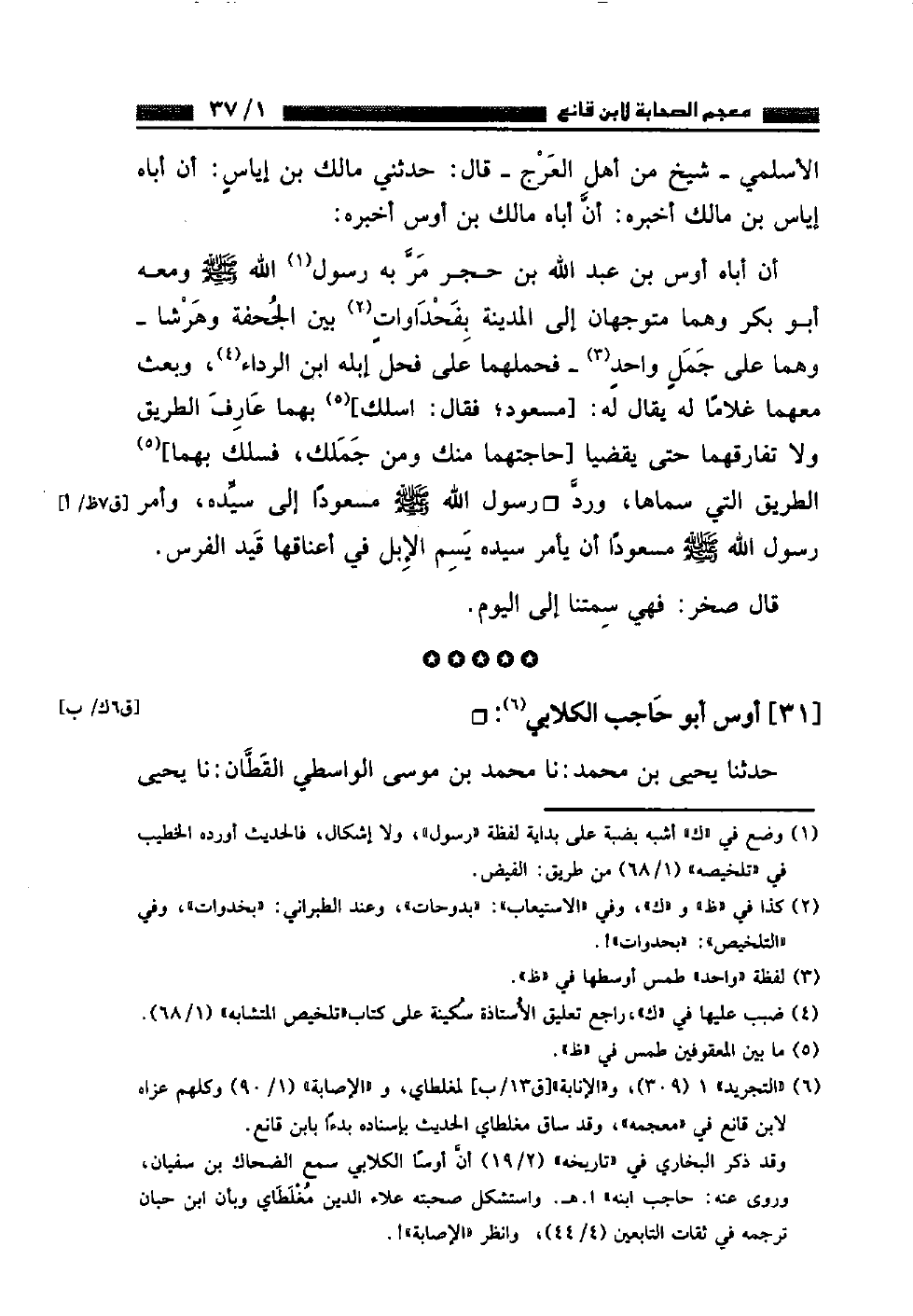 الْأَسْلَمِيُّ شَيْخٌ مِنْ أَهْلِ الْعَرْجِ قَالَ: حَدَّثَنِي مَالِكُ بْنُ إِيَاسَ أَنَّ أَبَاهُ إِيَاسُ بْنُ مَالِكٍ أَخْبَرَهُ أَنَّ أَبَاهُ مَالِكَ بْنَ أَوْسٍ أَخْبَرَهُ أَنَّ أَبَاهُ أَوْسَ بْنَ عَبْدِ اللَّهِ بْنِ حُجْرٍ مَرَّ بِهِ رَسُولُ اللَّهِ صَلَّى اللهُ عَلَيْهِ وَسَلَّمَ وَمَعَهُ أَبُو بَكْرٍ وَهُمَا مُتَوَجِّهَانِ إِلَى الْمَدِينَةِ بِفَحْدَاوَاتٍ بَيْنَ الْجُحْفَةِ وَهَرْشَا وَهُمَا عَلَى جَمَلٍ وَاحِدٍ فَحَمَلَهُمَا عَلَى فَحْلِ إِبِلِهِ ابْنُ الرِّدَاءِ وَبَعَثَ مَعَهُمَا غُلَامًا لَهُ يُقَالُ لَهُ مَسْعُودٌ فَقَالَ: اسْلُكْ بِهِمَا عَارِفَ الطَّرِيقِ وَلَا تُفَارِقْهُمَا حَتَّى يَقْضِيَا حَاجَتَهُمَا مِنْكَ وَمِنْ جَمَلِكَ فَسَلَكَ بِهِمَا الطَّرِيقَ الَّتِي سَمَّاهَا وَرَدَّ رَسُولُ اللَّهِ صَلَّى اللهُ عَلَيْهِ وَسَلَّمَ مَسْعُودًا إِلَى سَيِّدِهِ، «وَأَمَرَ رَسُولُ اللَّهِ صَلَّى اللهُ عَلَيْهِ وَسَلَّمَ مَسْعُودًا أَنْ يَأْمُرَ سَيِّدَهُ يَسِمُ الْإِبِلَ فِي أَعْنَاقِهَا قِيدَ الْفَرَسِ» قَالَ صَخْرٌ: فِيهِ سِمَتُنَا إِلَى الْيَوْمِ