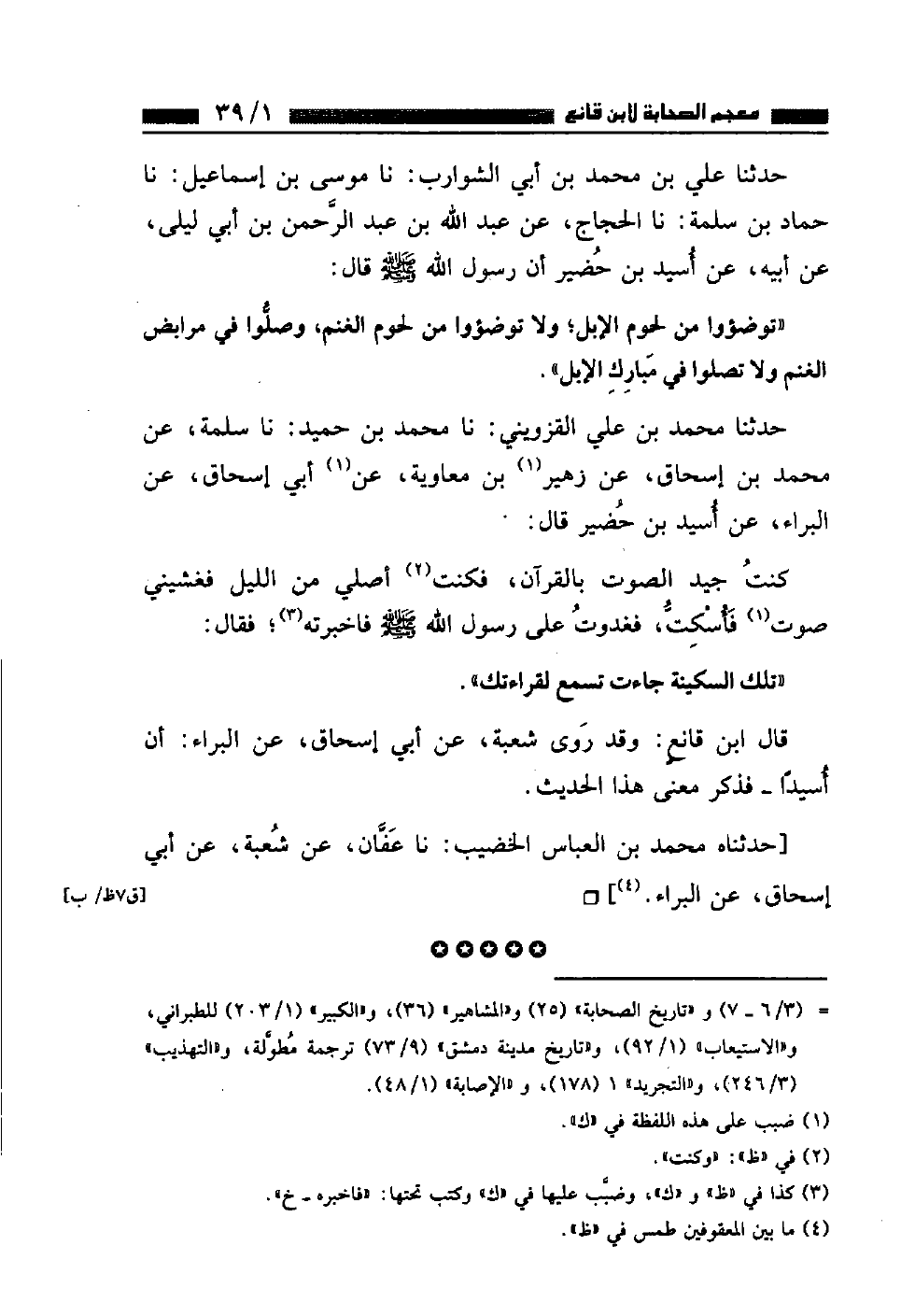 حَدَّثَنَا مُحَمَّدُ بْنُ عَلِيٍّ الْقَزْوِينِيُّ، نا مُحَمَّدُ بْنُ حُمَيْدٍ، نا سَلَمَةُ، عَنْ مُحَمَّدِ بْنِ إِسْحَاقَ، عَنْ زُهَيْرِ بْنِ مُعَاوِيَةَ، عَنْ أَبِي إِسْحَاقَ، عَنِ الْبَرَاءِ، عَنْ أُسَيْدِ بْنِ حُضَيْرٍ قَالَ كُنْتُ جَيِّدَ الصَّوْتِ بِالْقُرْآنِ فَكُنْتُ أُصَلِّي مِنَ اللَّيْلِ فَغَشِيَنِي صَوْتٌ فَأُسْكِتُّ فَغَدَوْتُ عَلَى رَسُولِ اللَّهِ صَلَّى اللهُ عَلَيْهِ وَسَلَّمَ فَأَخْبَرْتُهُ فَقَالَ: «تِلْكَ السَّكِينَةُ جَاءَتْ تَسْمَعُ لِقِرَاءَتِكَ» قَالَ ابْنُ قَانِعٍ: وَقَدْ رَوَى شُعْبَةُ عَنْ أَبِي إِسْحَاقَ عَنِ الْبَرَاءِ أَنَّ أُسَيْدًا فَذَكَرَ مَعْنَى هَذَا الْحَدِيثِ حَدَّثَنَاهُ مُحَمَّدُ بْنُ الْعَبَّاسِ الْخَضِيبُ نا عَفَّانُ عَنْ شُعْبَةَ عَنْ أَبِي إِسْحَاقَ عَنِ الْبَرَاءِ
